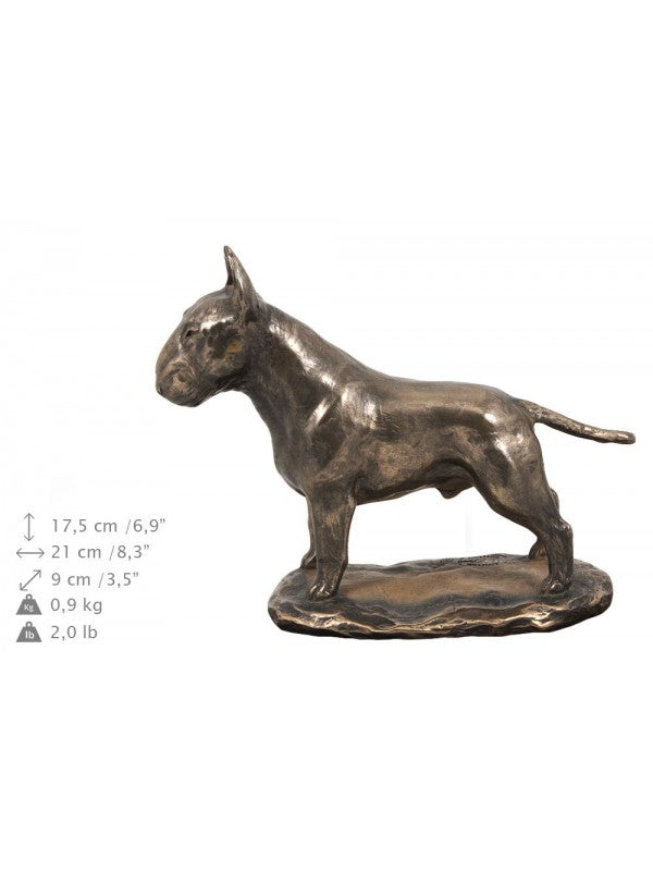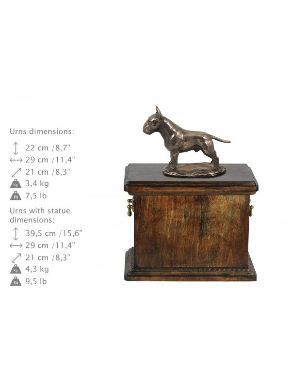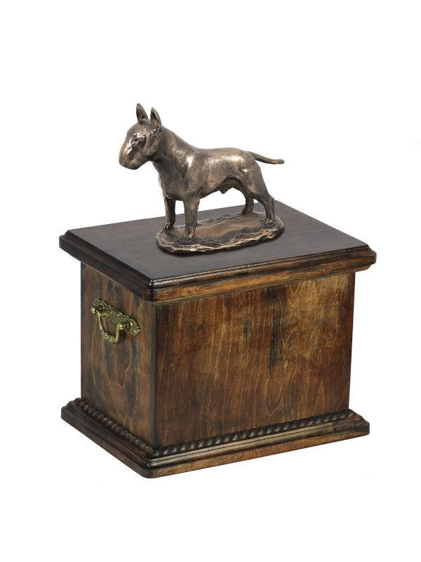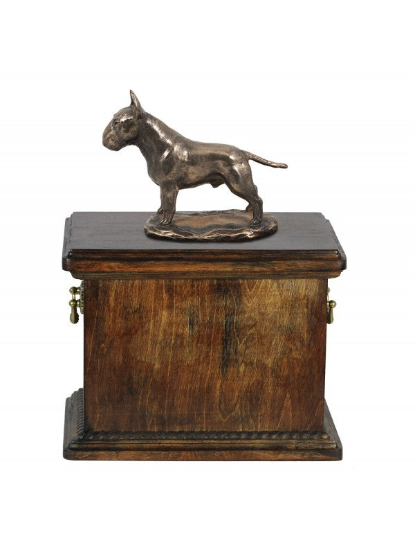 Handgjord Bullterrier-urna i björk med handtag i mässing och avtagbart lock. Noga utvalda kransformade detaljer. Statyett i kallstöpt brons med interiör i stark kvarts.