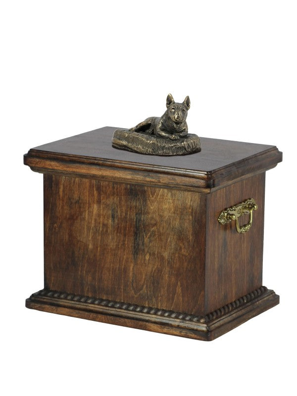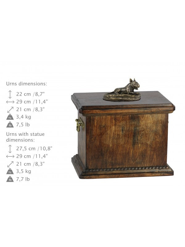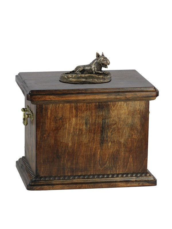 Handgjord Bullterrier-urna i björk med handtag i mässing och avtagbart lock. Noga utvalda kransformade detaljer. Statyett i kallstöpt brons med interiör i stark kvarts.