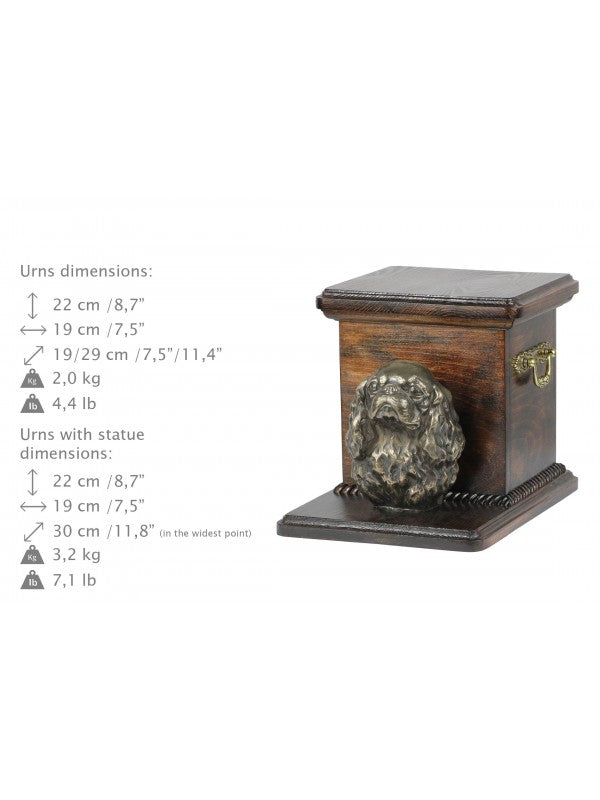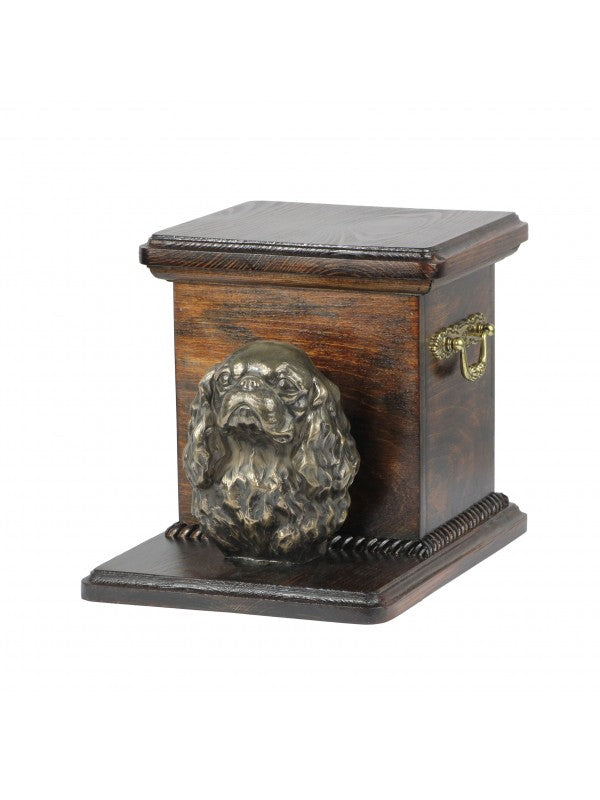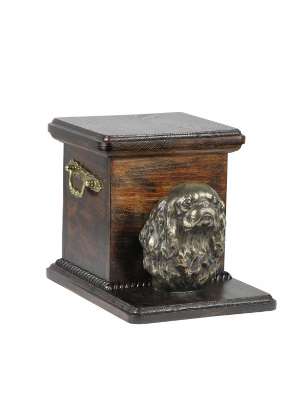 Handgjord Cavalier King Charles Spaniel-urna i björk med handtag i mässing och avtagbart lock. Noga utvalda kransformade detaljer. Statyett i kallstöpt brons med interiör i stark kvarts.
