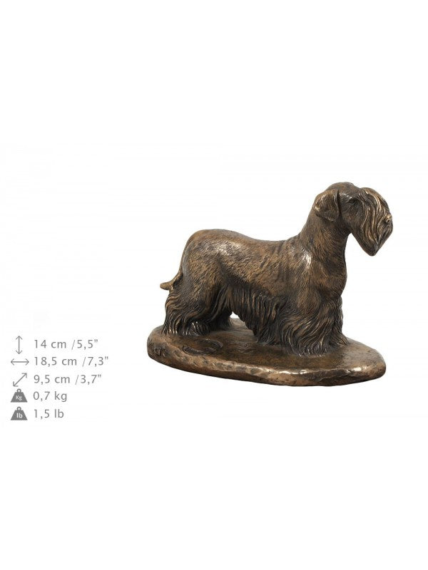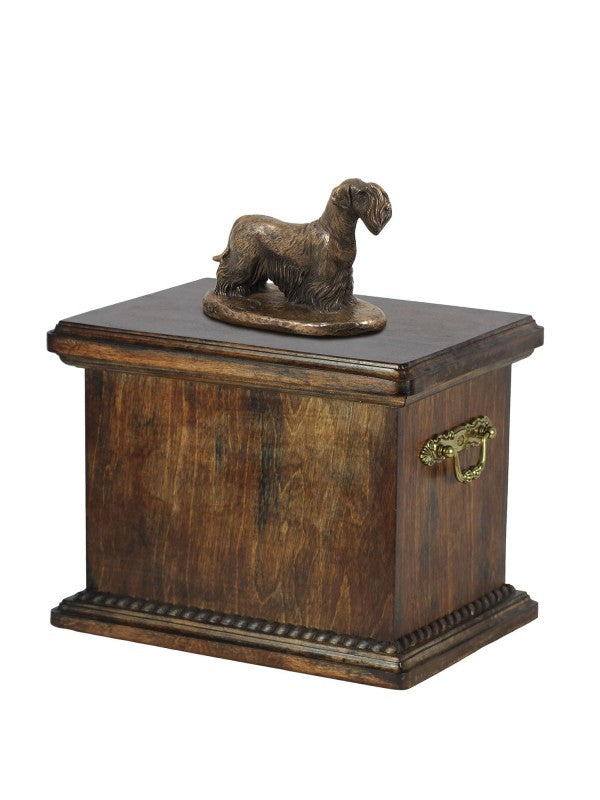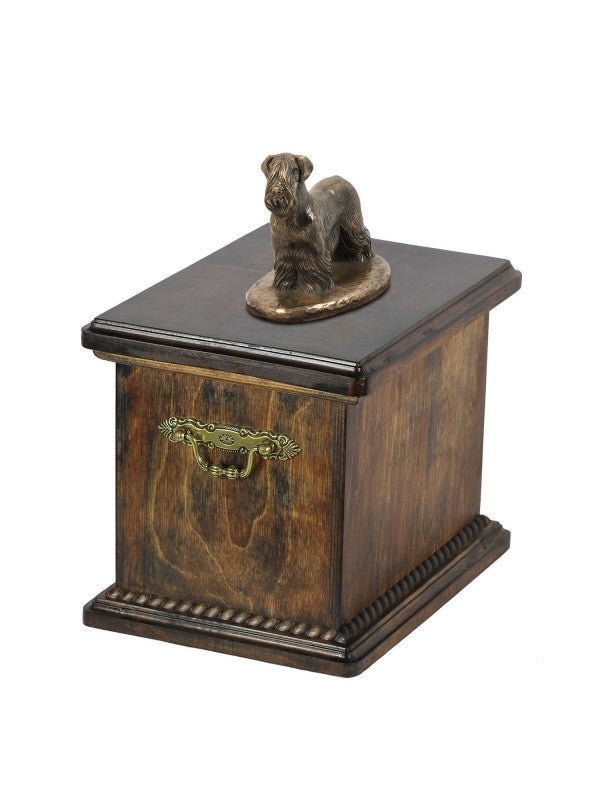 Handgjord Ceskyterrier-urna i björk med handtag i mässing och avtagbart lock. Noga utvalda kransformade detaljer. Statyett i kallstöpt brons med interiör i stark kvarts.