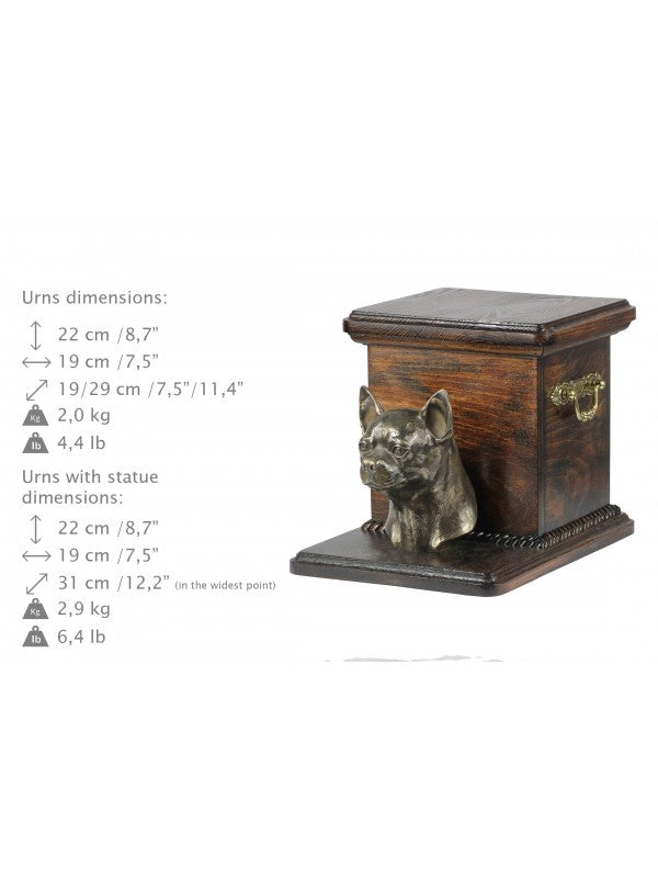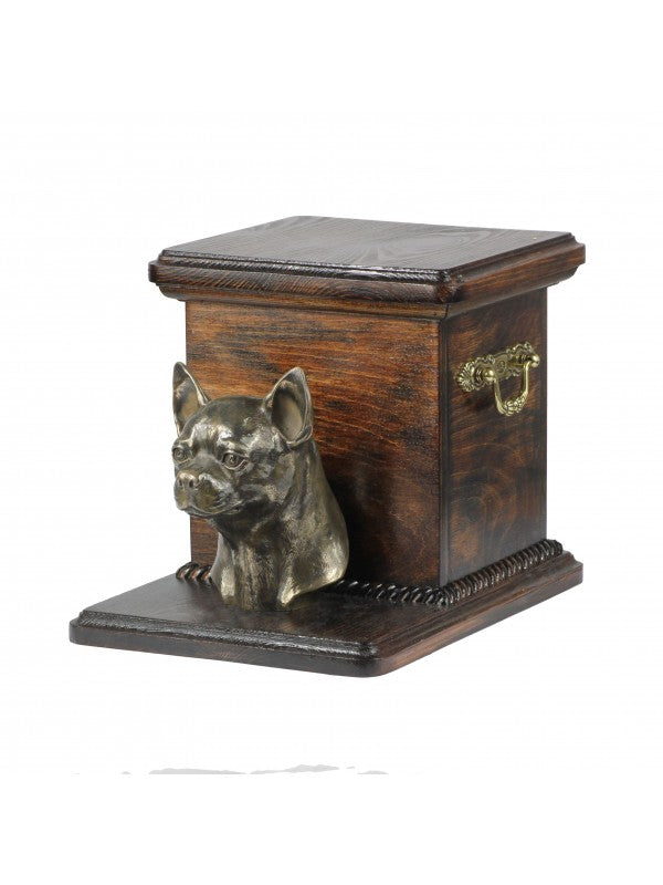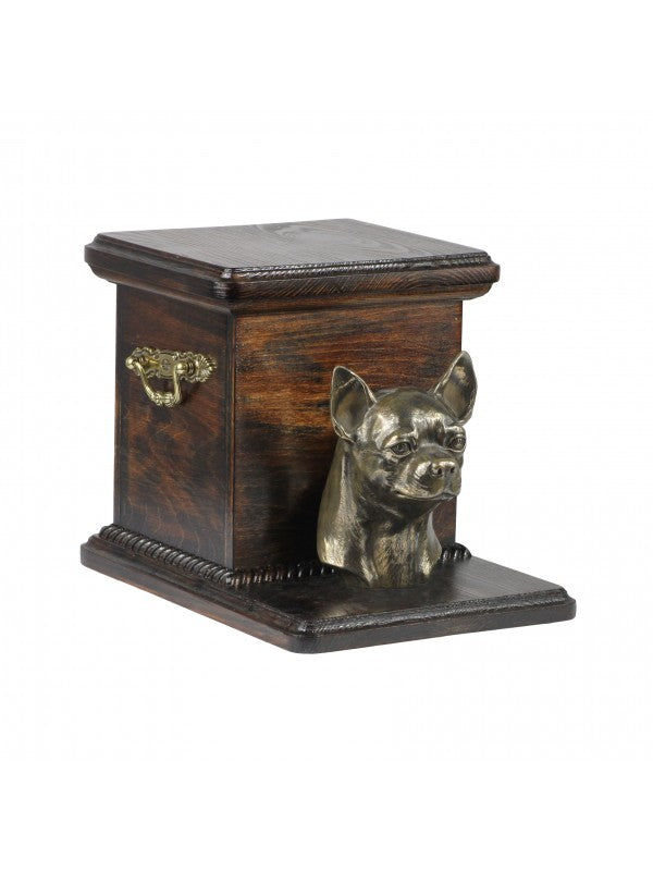 Handgjord Chihuahua-urna i björk med handtag i mässing och avtagbart lock. Noga utvalda kransformade detaljer. Statyett i kallstöpt brons med interiör i stark kvarts.