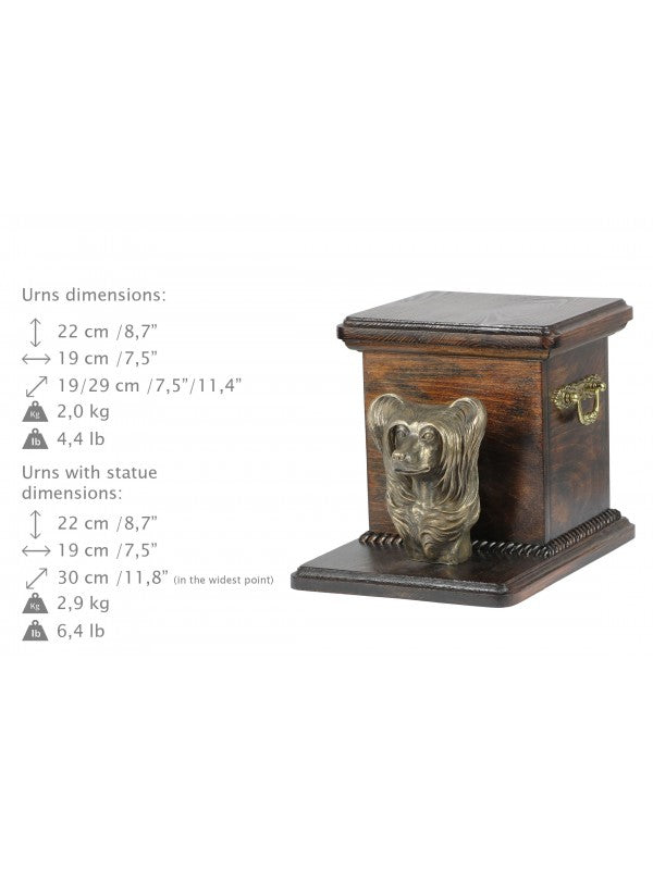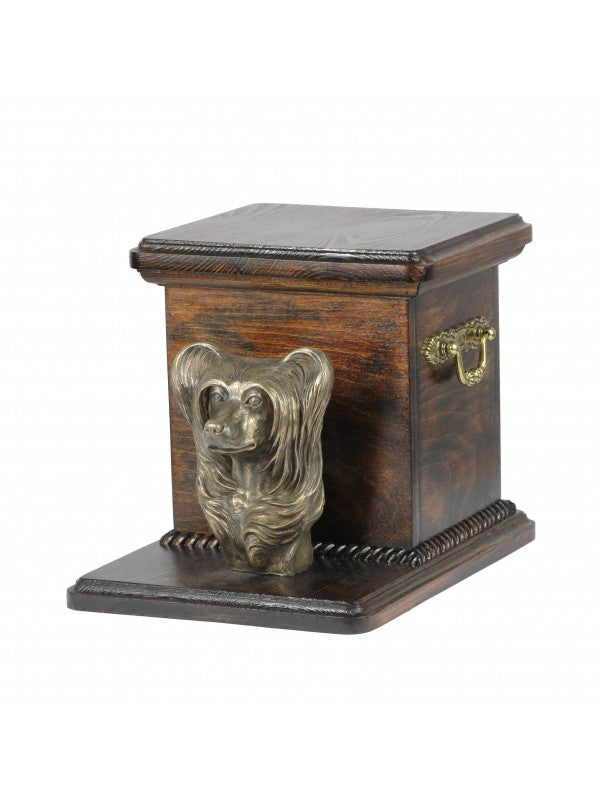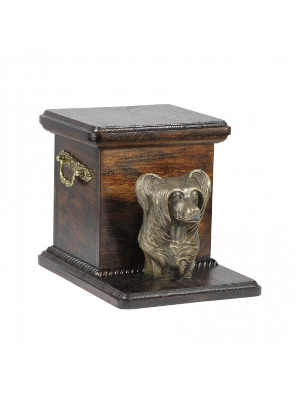 Handgjord Chinese crested-urna i björk med handtag i mässing och avtagbart lock. Noga utvalda kransformade detaljer. Statyett i kallstöpt brons med interiör i stark kvarts.