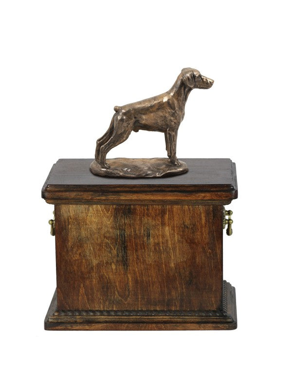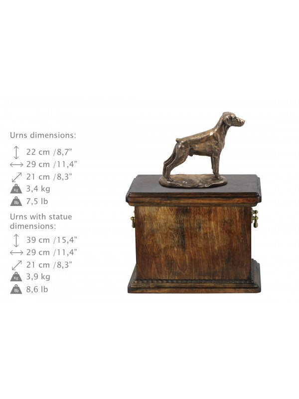 Handgjord Doberman pinscher-urna i björk med handtag i mässing och avtagbart lock. Noga utvalda kransformade detaljer. Statyett i kallstöpt brons med interiör i stark kvarts.