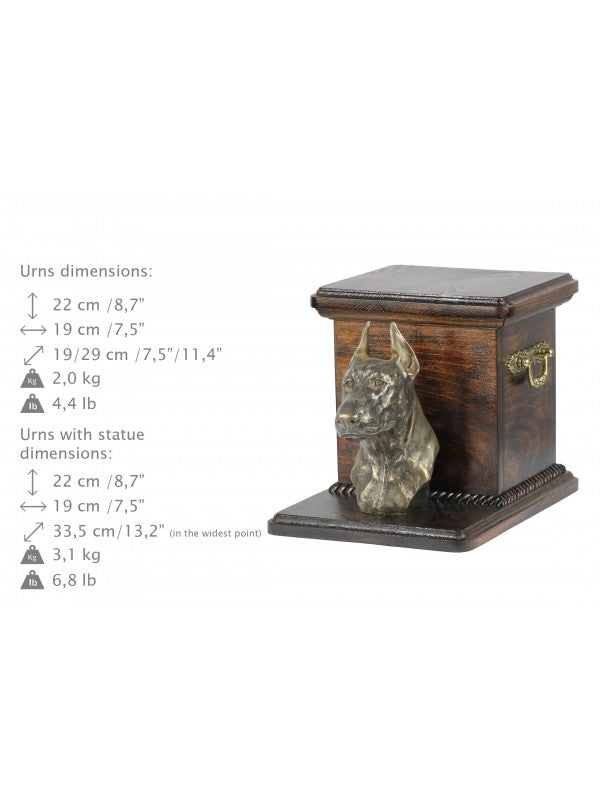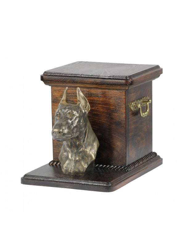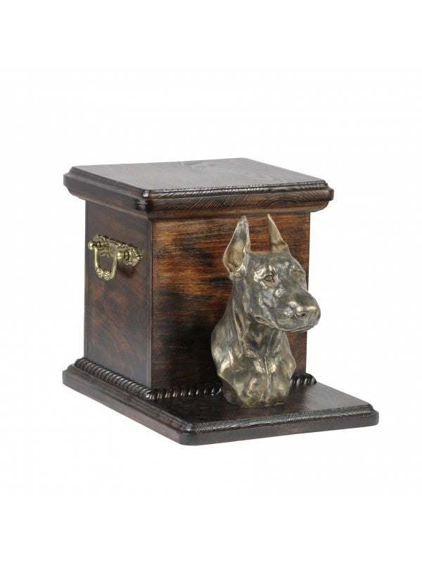 Handgjord Doberman pinscher-urna i björk med handtag i mässing och avtagbart lock. Noga utvalda kransformade detaljer. Statyett i kallstöpt brons med interiör i stark kvarts.