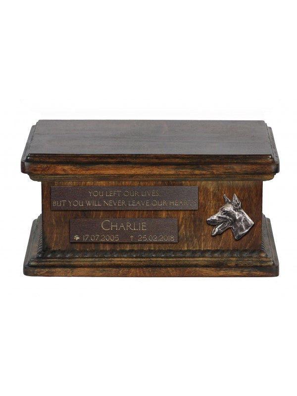 Handgjord Dobermann-urna i björk med handtag i mässing och avtagbart lock. Noga utvalda kransformade detaljer.