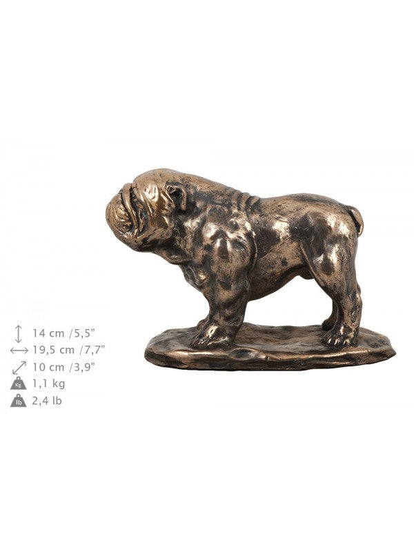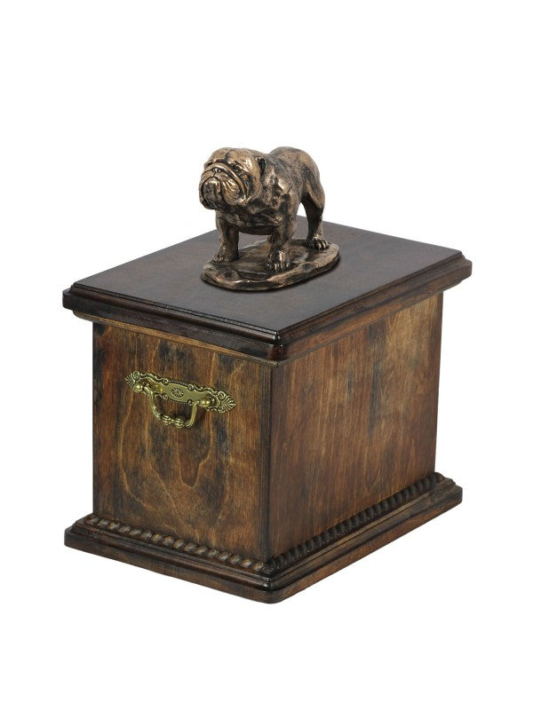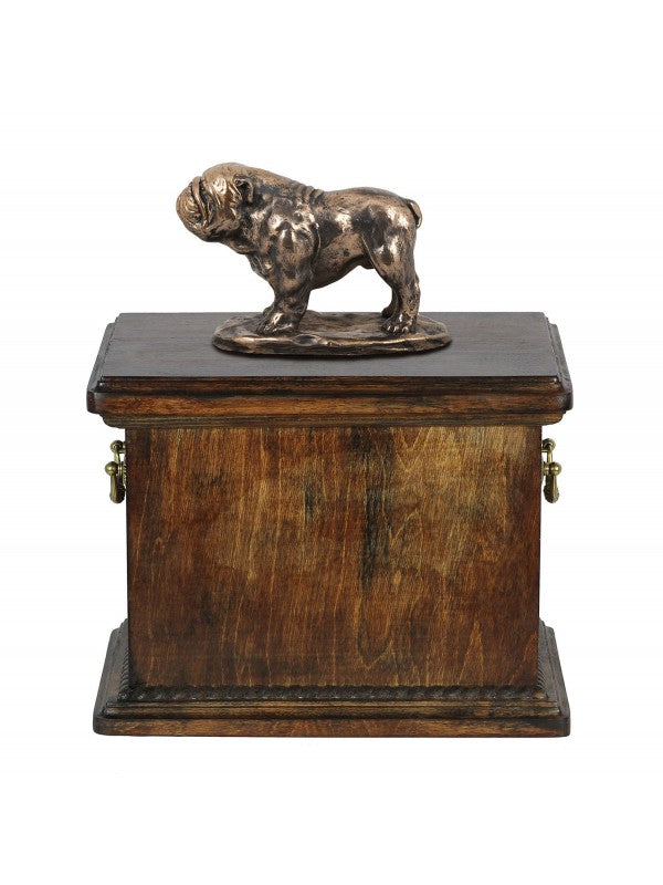 Handgjord Engelsk bulldogg-urna i björk med handtag i mässing och avtagbart lock. Noga utvalda kransformade detaljer. Statyett i kallstöpt brons med interiör i stark kvarts.