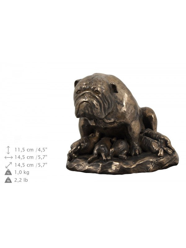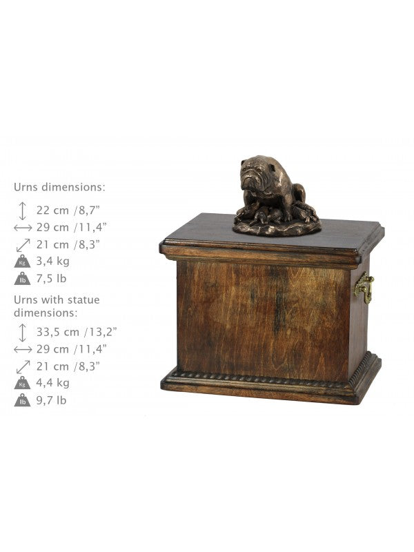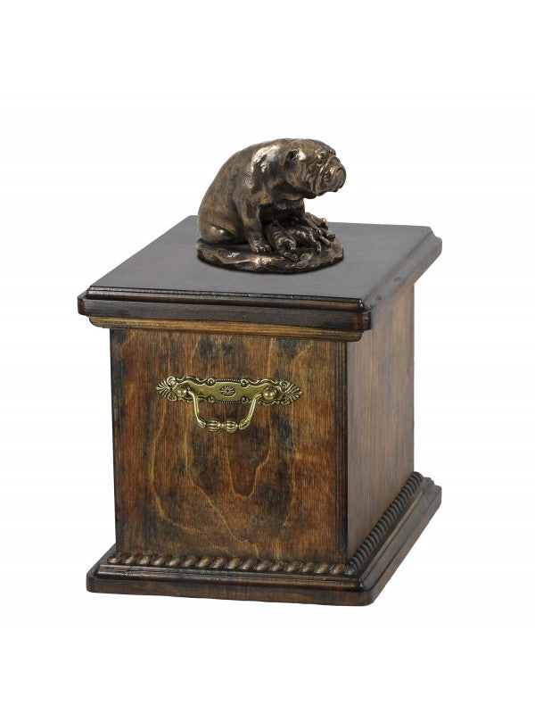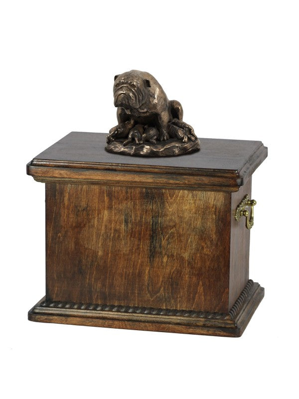 Handgjord Engelsk bulldogg-urna i björk med handtag i mässing och avtagbart lock. Noga utvalda kransformade detaljer. Statyett i kallstöpt brons med interiör i stark kvarts.