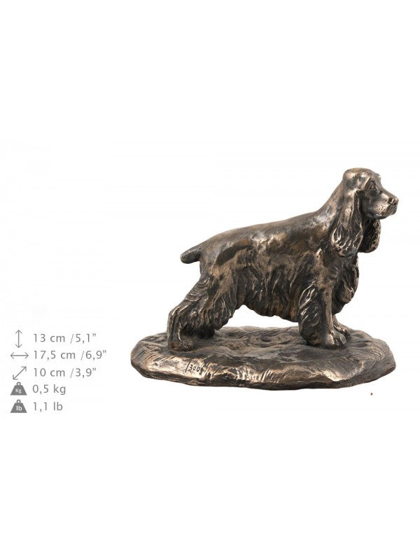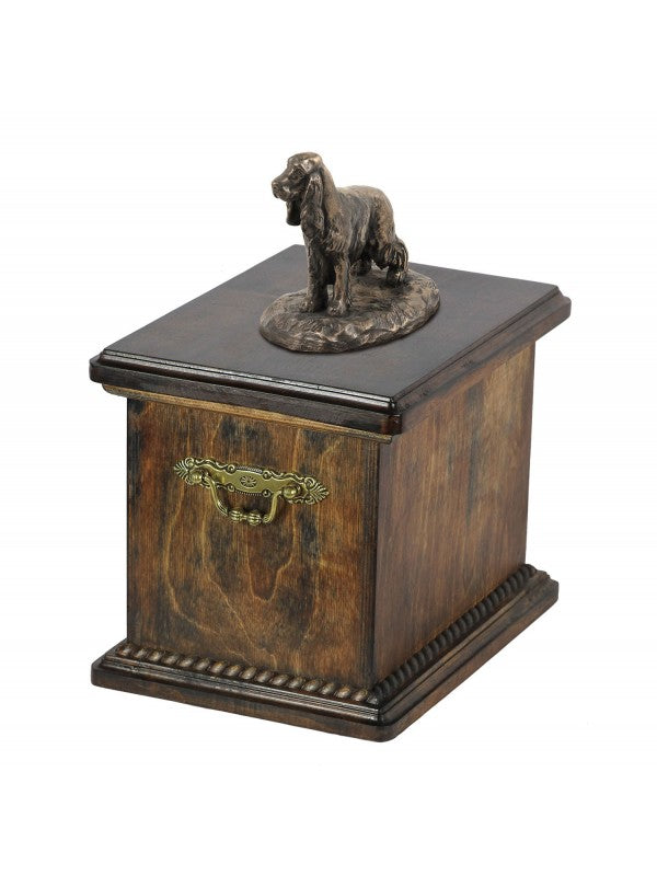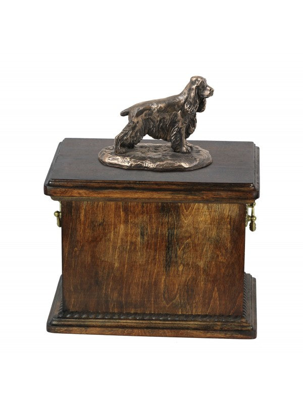 Handgjord Engelsk Cocker Spaniel-urna i björk med handtag i mässing och avtagbart lock. Noga utvalda kransformade detaljer. Statyett i kallstöpt brons med interiör i stark kvarts.