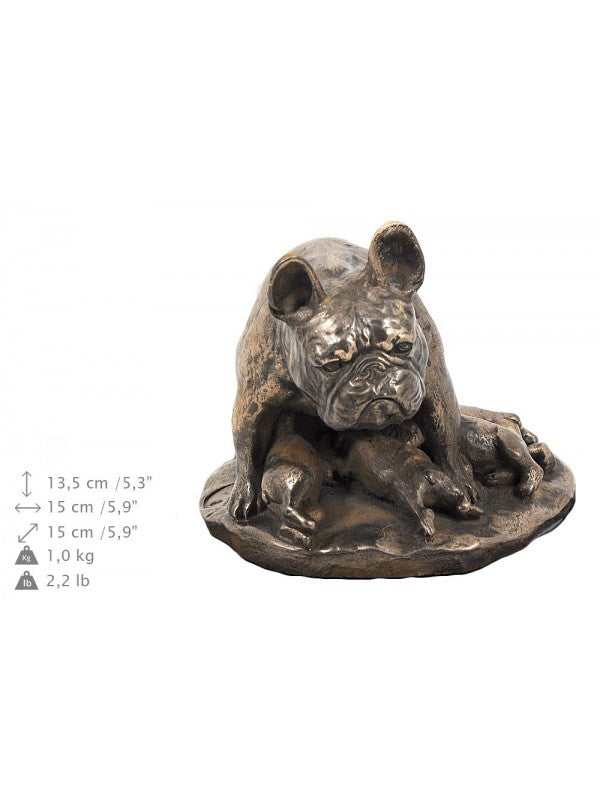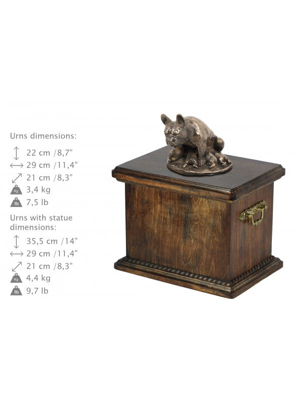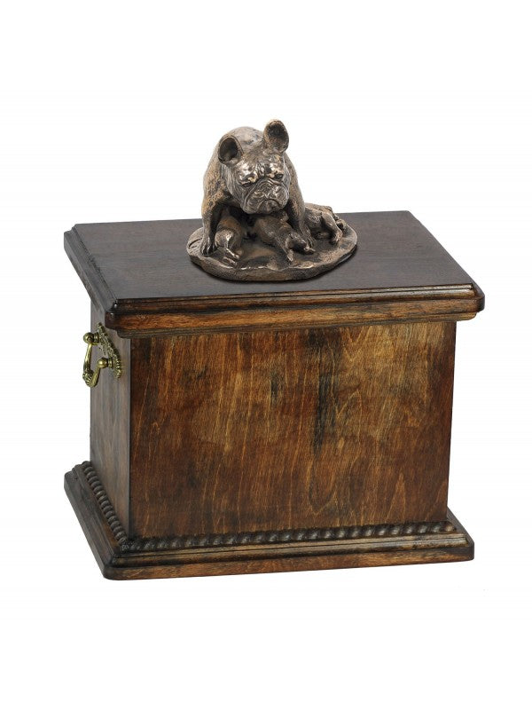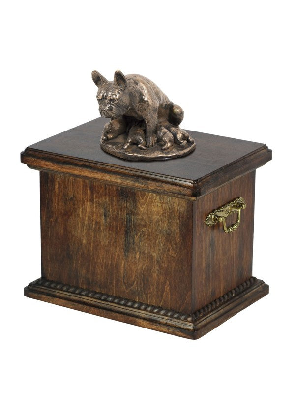Handgjord Fransk bulldogg-urna i björk med handtag i mässing och avtagbart lock. Noga utvalda kransformade detaljer. Statyett i kallstöpt brons med interiör i stark kvarts.