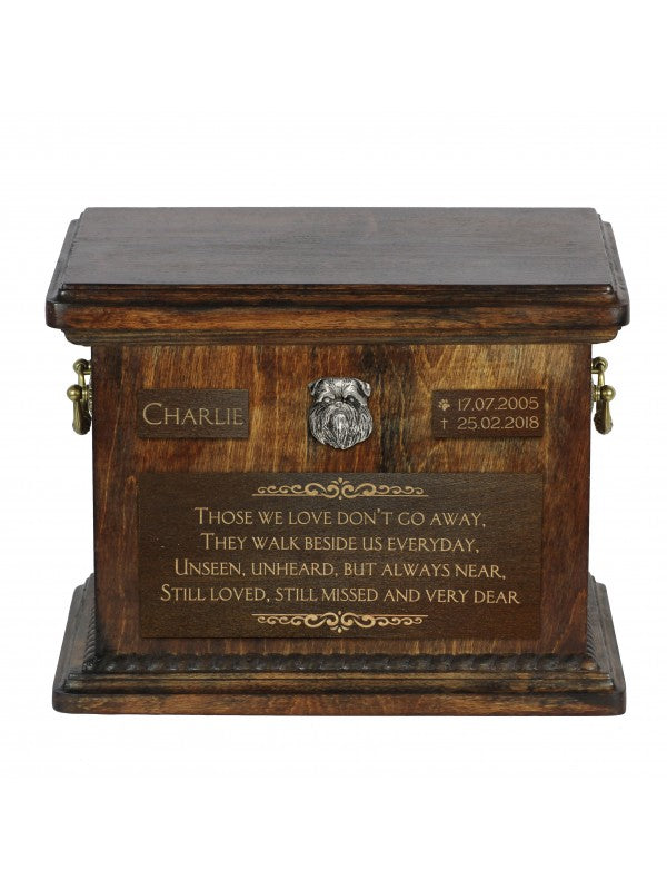 Handgjord Griffon bruxellois-urna i björk med handtag i mässing och avtagbart lock. Noga utvalda kransformade detaljer.