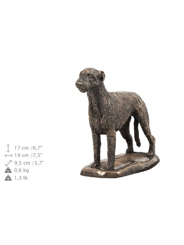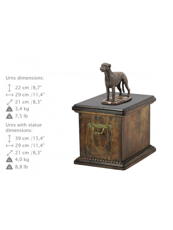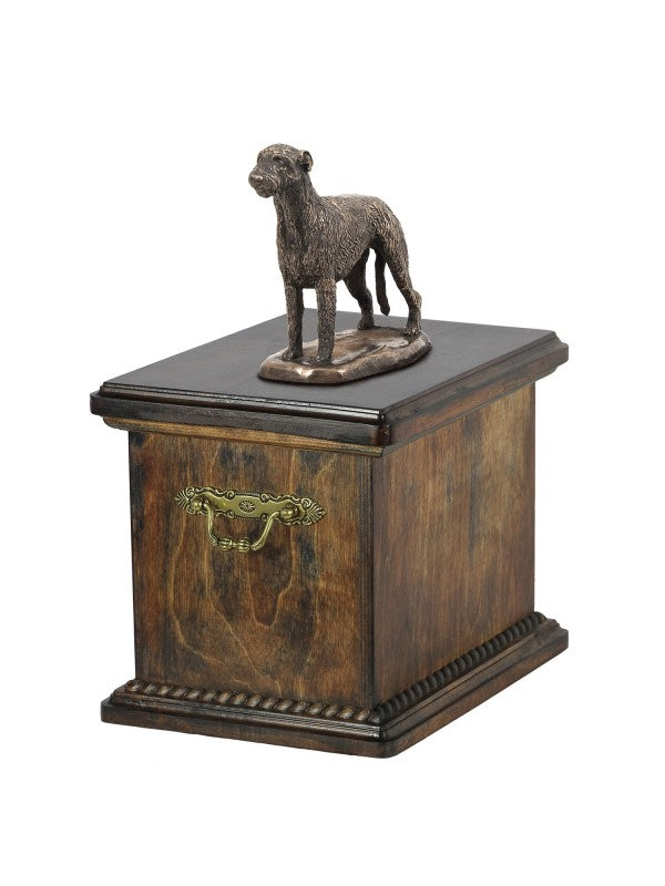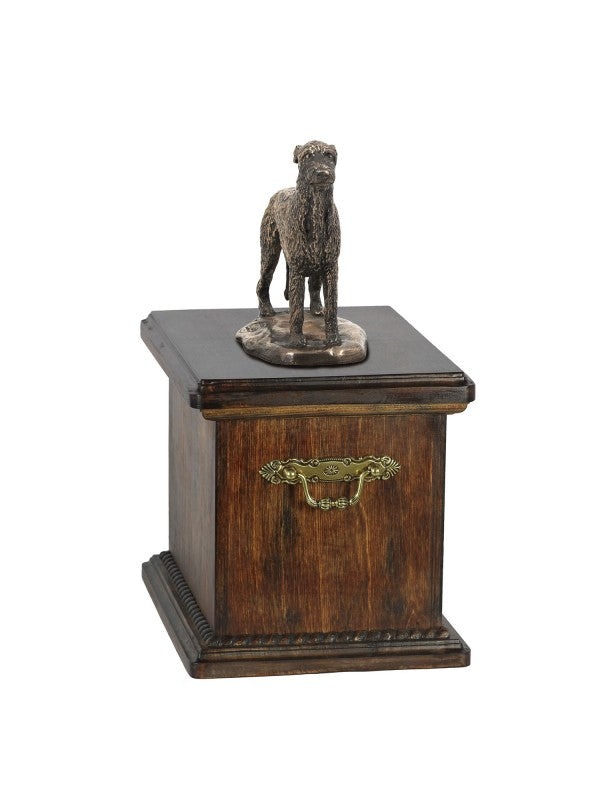 Handgjord Irländsk varghund-urna i björk med handtag i mässing och avtagbart lock. Noga utvalda kransformade detaljer. Statyett i kallstöpt brons med interiör i stark kvarts.