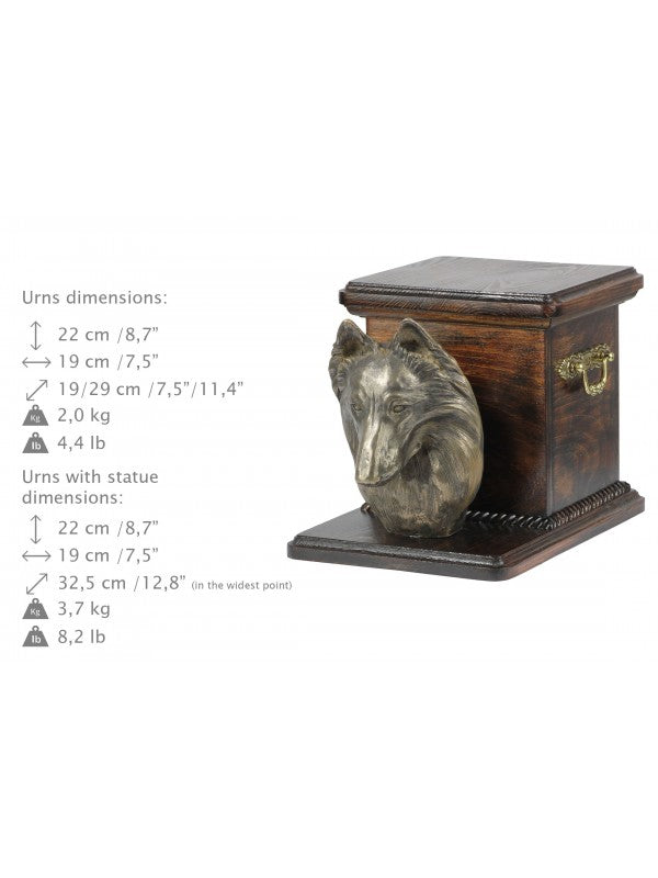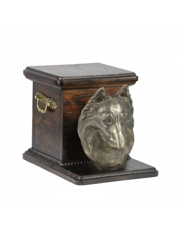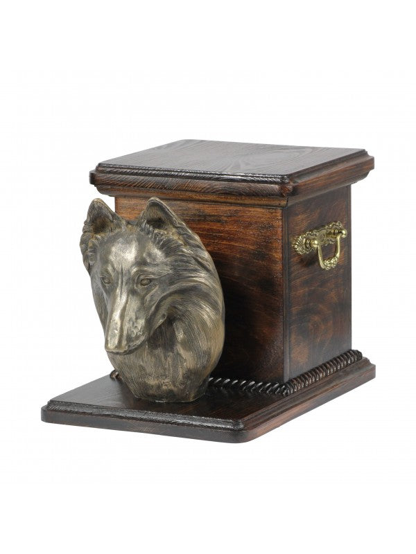 Handgjord Malinois-urna i björk med handtag i mässing och avtagbart lock. Noga utvalda kransformade detaljer. Statyett i kallstöpt brons med interiör i stark kvarts.