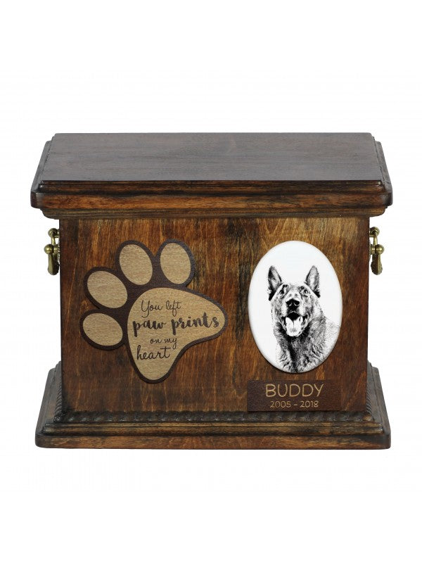Handgjord Malinois-urna i björk med ingraverad keramikplatta, handtag i mässing och avtagbart lock. Noga utvalda kransformade detaljer.
