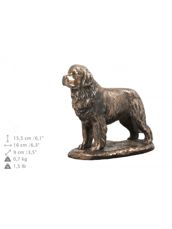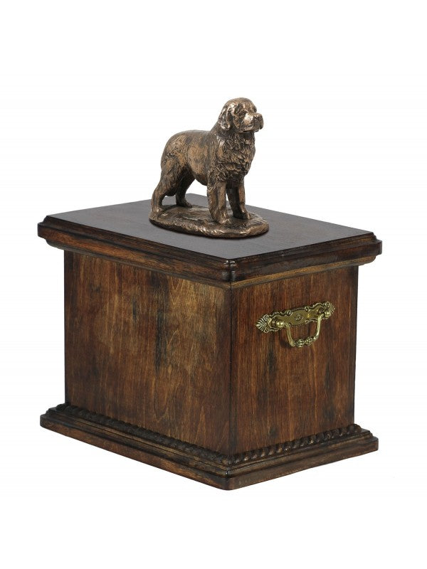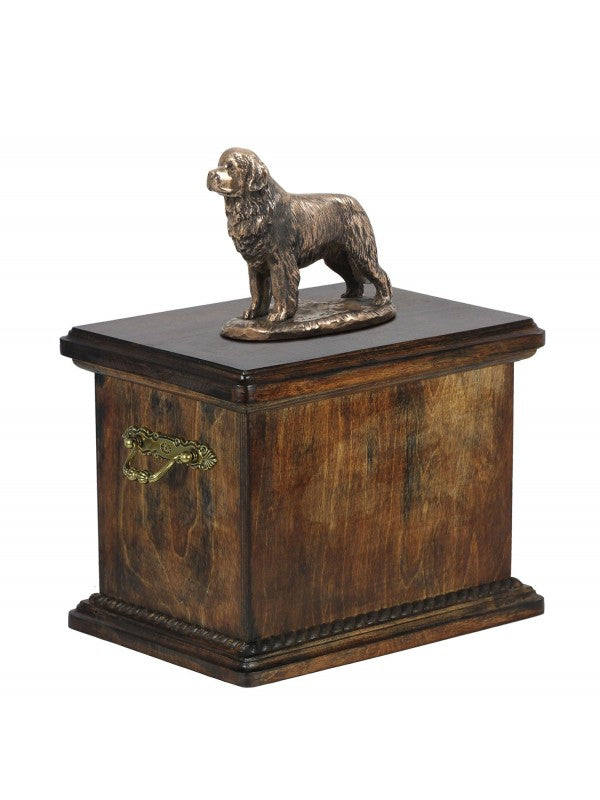 Handgjord Newfoundlandshund-urna i björk med handtag i mässing och avtagbart lock. Noga utvalda kransformade detaljer. Statyett i kallstöpt brons med interiör i stark kvarts.