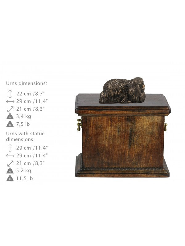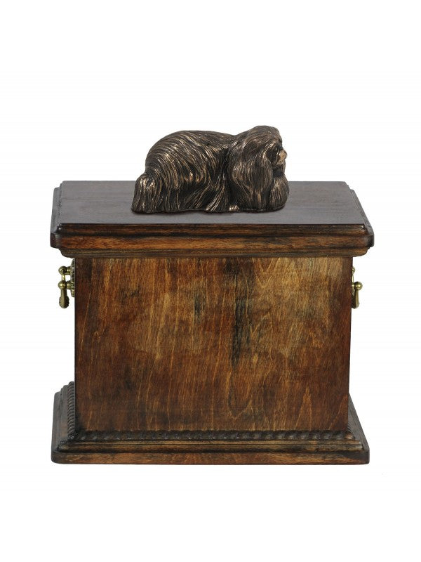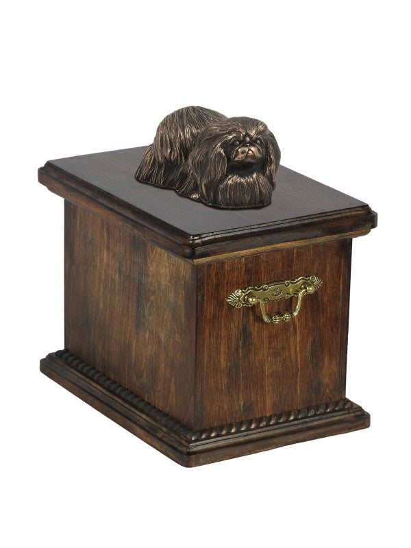 Handgjord Pekingese-urna i björk med handtag i mässing och avtagbart lock. Noga utvalda kransformade detaljer. Statyett i kallstöpt brons med interiör i stark kvarts.