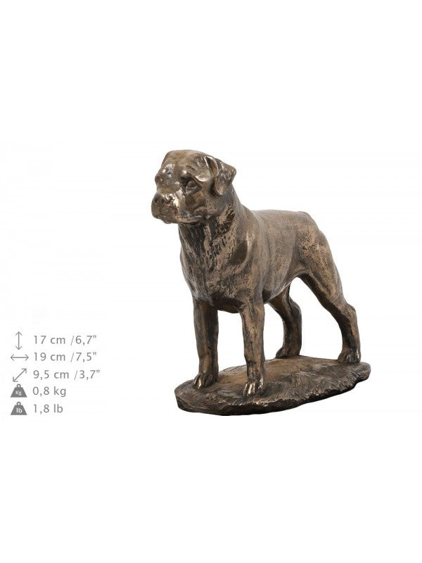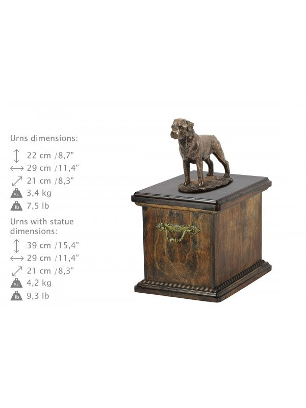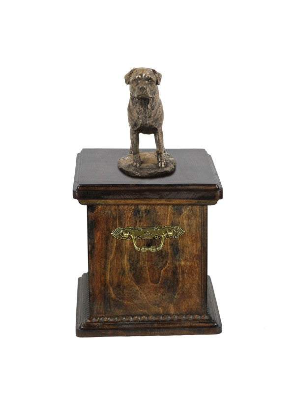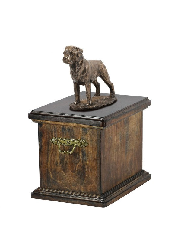 Handgjord Rottweiler-urna i björk med handtag i mässing och avtagbart lock. Noga utvalda kransformade detaljer. Statyett i kallstöpt brons med interiör i stark kvarts.