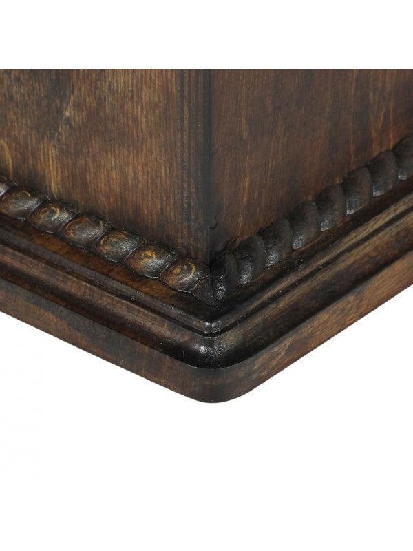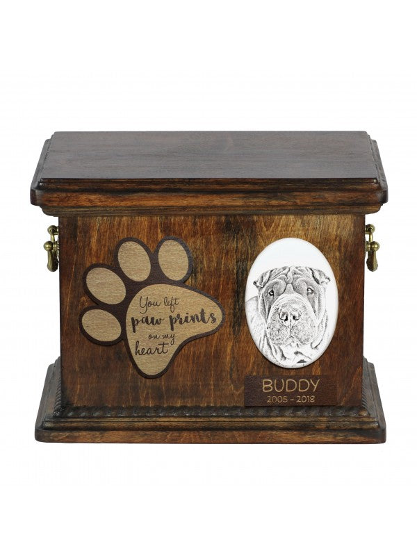Handgjord Shar pei-urna i björk med ingraverad keramikplatta, handtag i mässing och avtagbart lock. Noga utvalda kransformade detaljer.