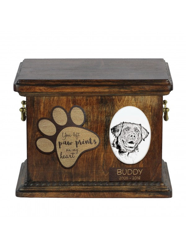 Handgjord Stabyhoun-urna i björk med ingraverad keramikplatta, handtag i mässing och avtagbart lock. Noga utvalda kransformade detaljer.