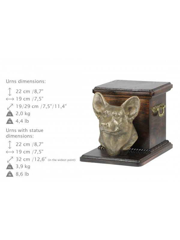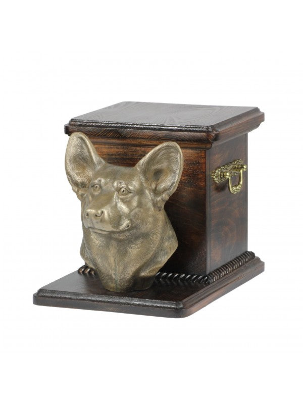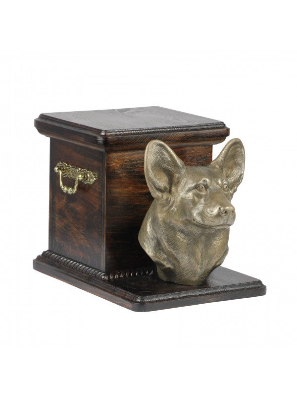 Handgjord Welsh corgi pembroke-urna i björk med handtag i mässing och avtagbart lock. Noga utvalda kransformade detaljer. Statyett i kallstöpt brons med interiör i stark kvarts.