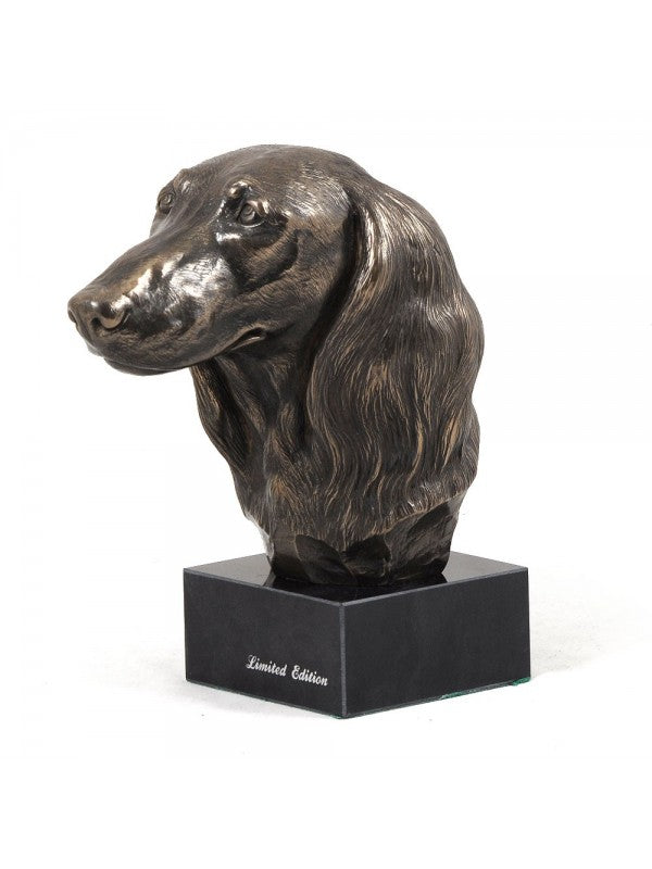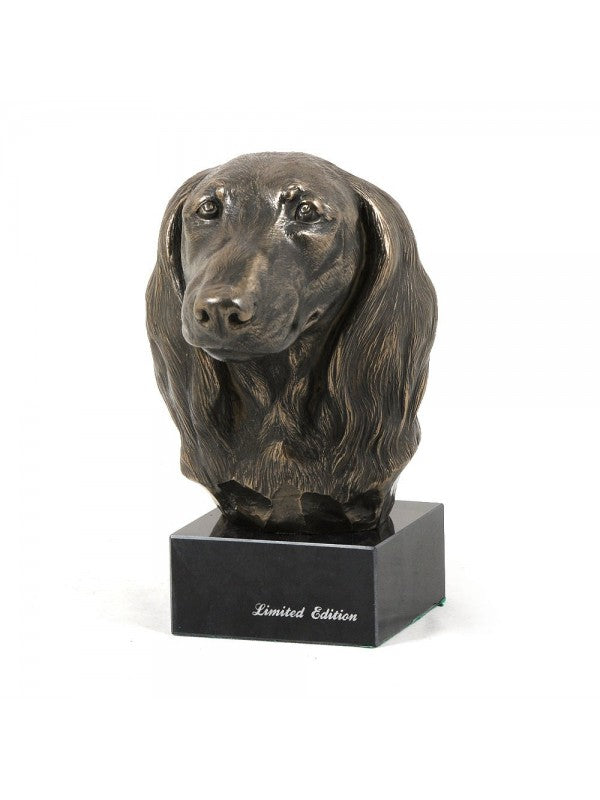 Handgjord Jamnik długowłosy-figurin i kallstöpt brons med interiör i stark kvarts ståendes på marmor i begränsad upplaga.