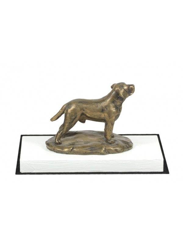 Handgjord Labrador retriever-statyett i äkta brons med interiör i stark kvarts ståendes på bas i vitt trä i begränsad upplaga.