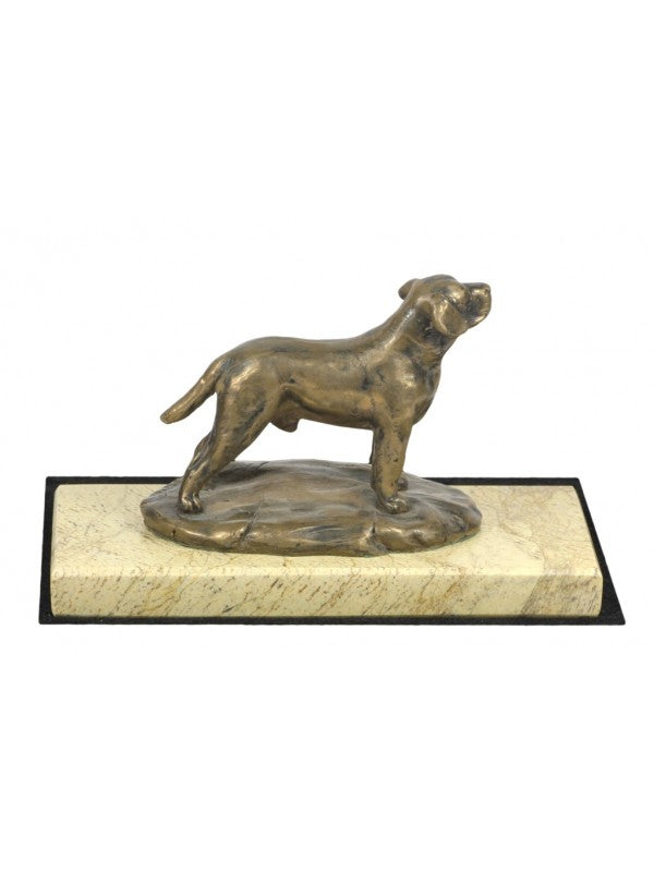Handgjord Labrador Retriever-statyett i kallstöpt brons med interiör i stark kvarts ståendes på sandmarmor i begränsad upplaga.
