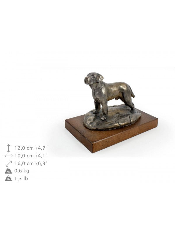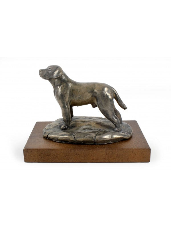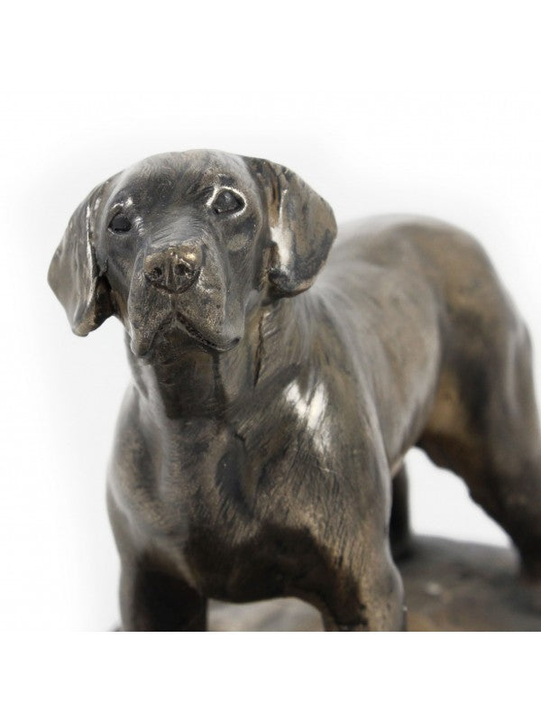 Handgjord Labrador retriever-statyett i kallstöpt brons med interiör i stark kvarts ståendes på bas i trä i begränsad upplaga.
