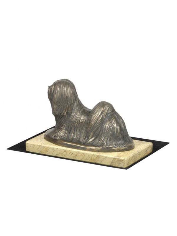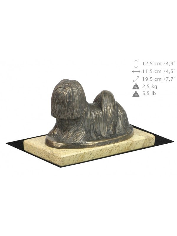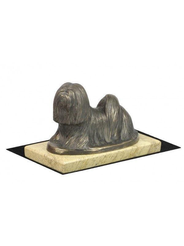 Handgjord Lhasa apso-statyett i kallstöpt brons med interiör i stark kvarts ståendes på sandmarmor i begränsad upplaga.