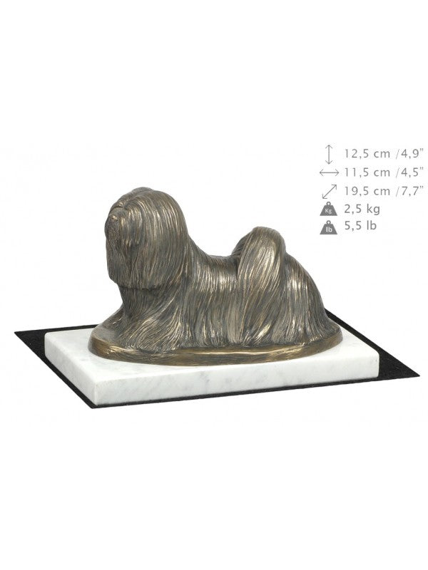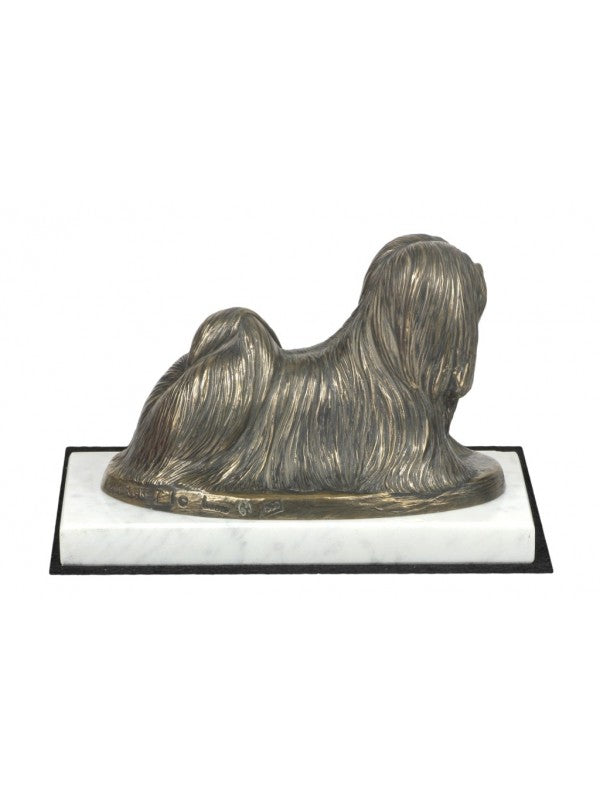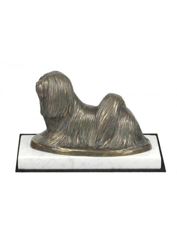 Handgjord Lhasa Apso-statyetti kallstöpt brons med interiör i stark kvarts ståendes på vit marmor i begränsad upplaga.