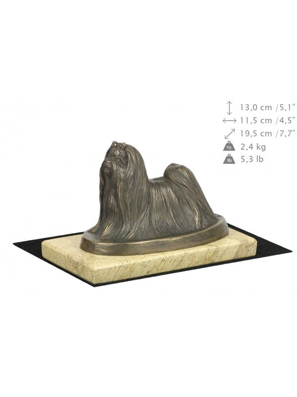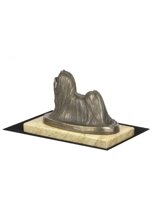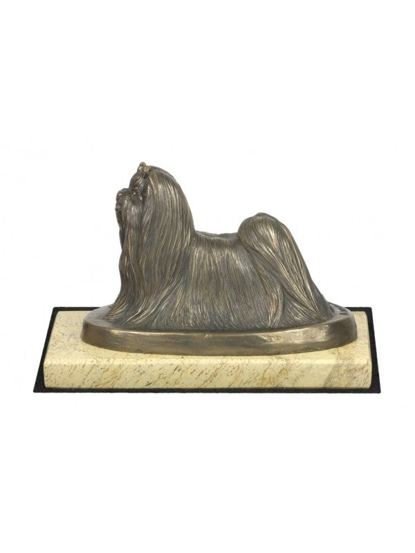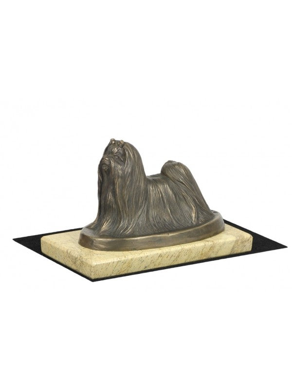 Handgjord Malteser-statyett i kallstöpt brons med interiör i stark kvarts ståendes på sandmarmor i begränsad upplaga.