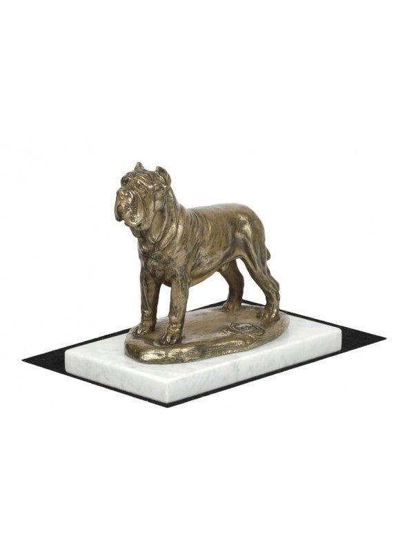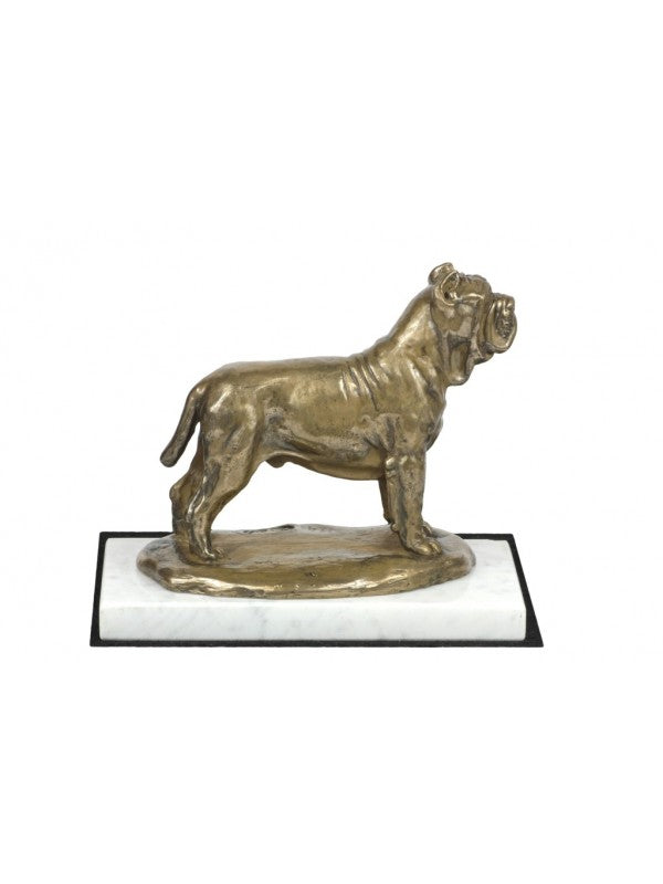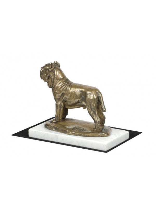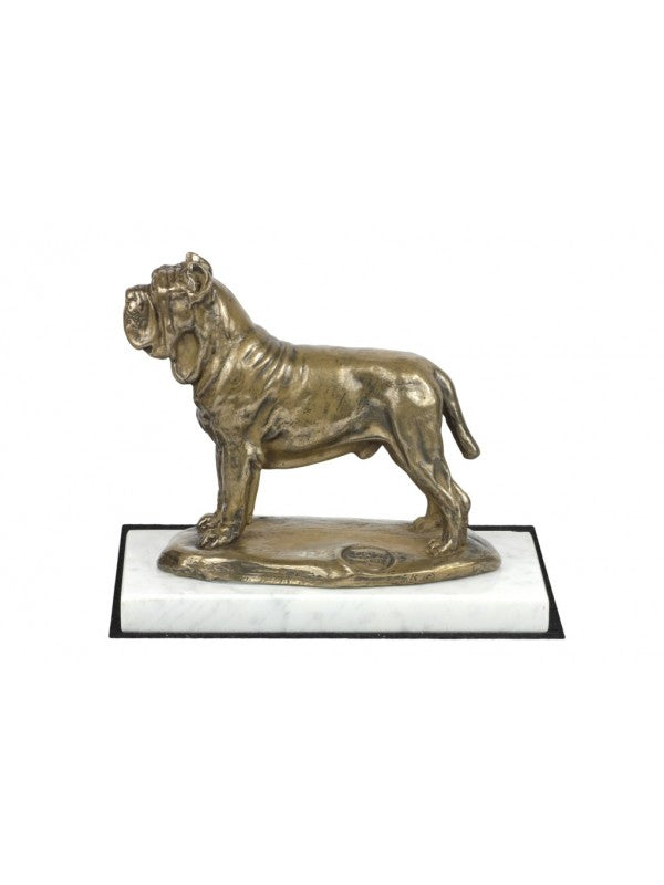 Handgjord Mastino napoletano-statyetti kallstöpt brons med interiör i stark kvarts ståendes på vit marmor i begränsad upplaga.