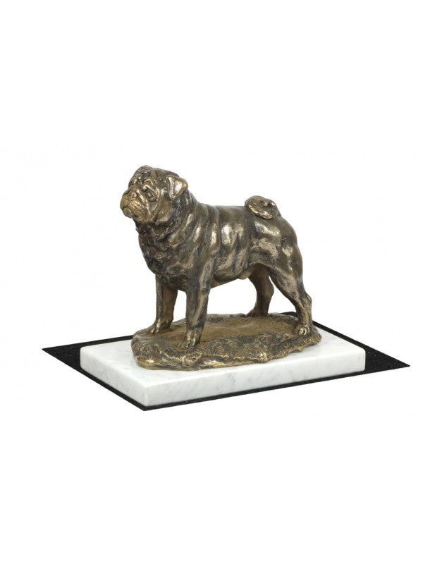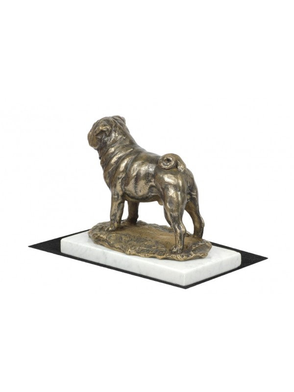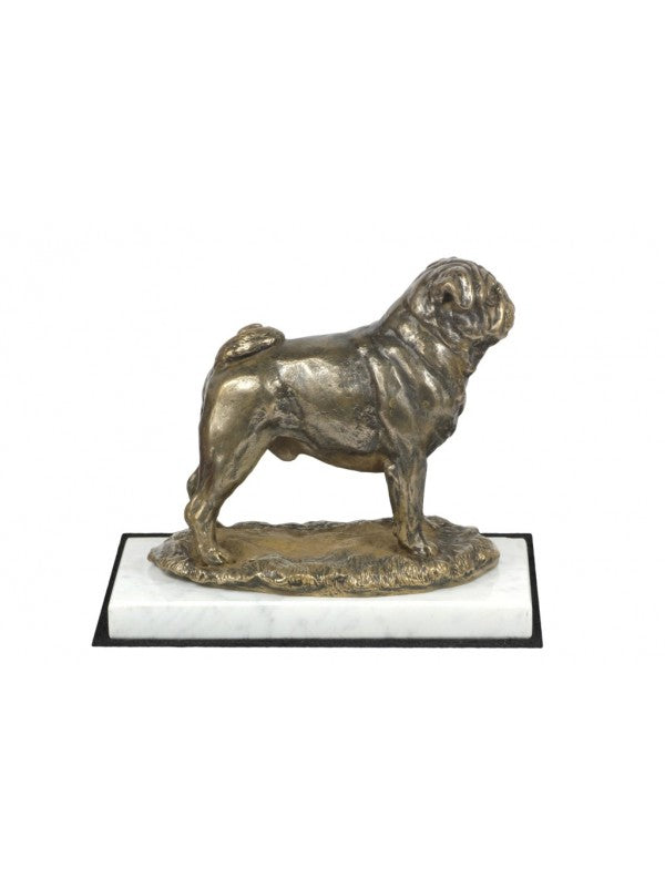 Handgjord Mops-statyetti kallstöpt brons med interiör i stark kvarts ståendes på vit marmor i begränsad upplaga.