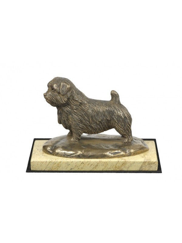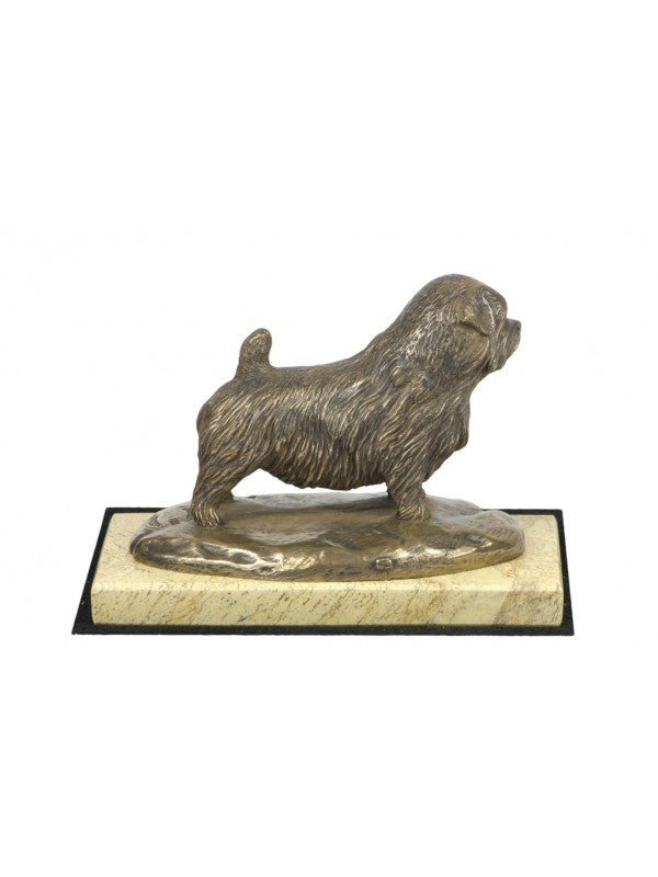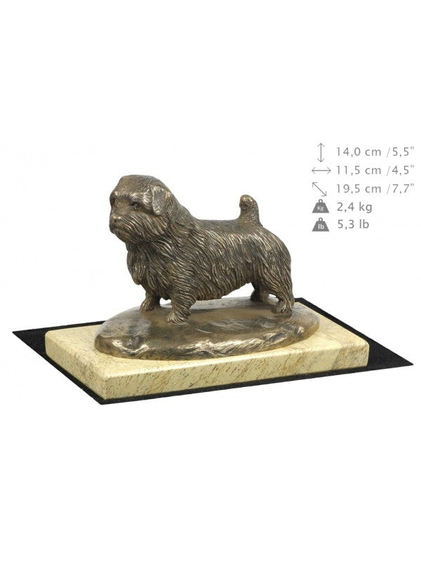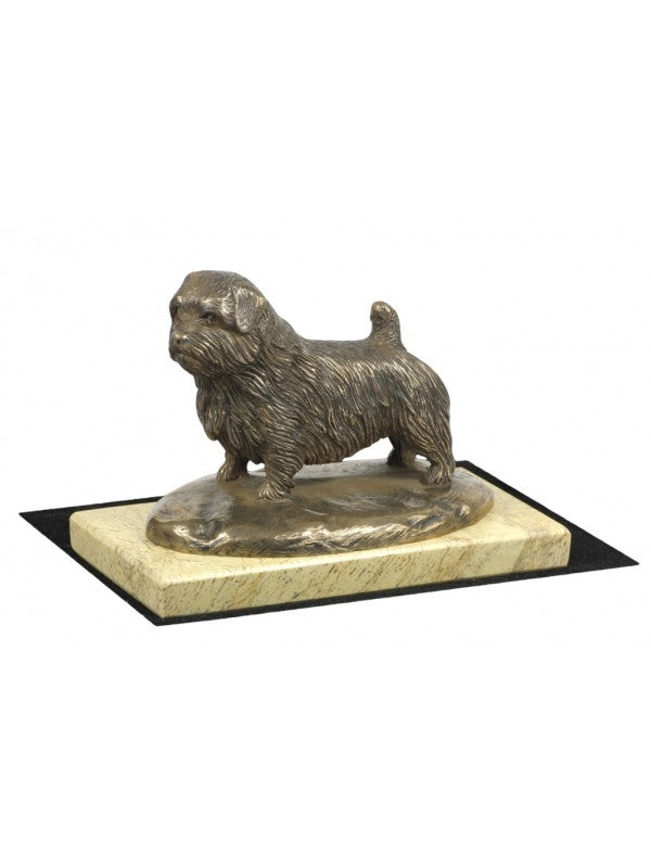 Handgjord Norfolkterrier-statyett i kallstöpt brons med interiör i stark kvarts ståendes på sandmarmor i begränsad upplaga.