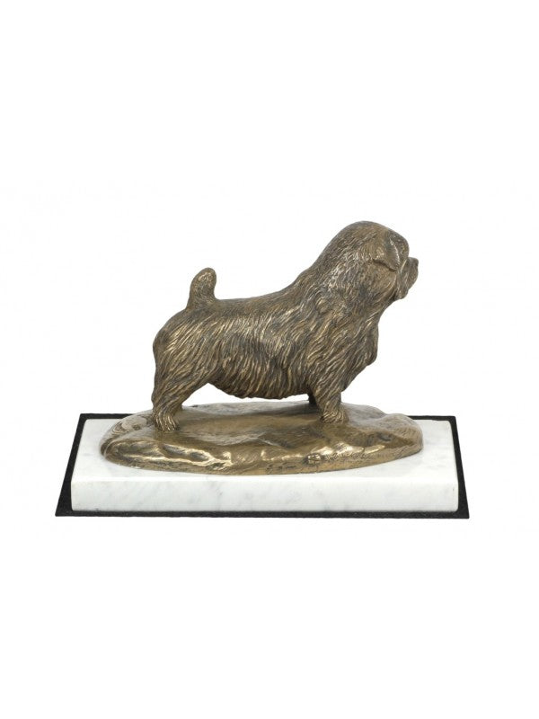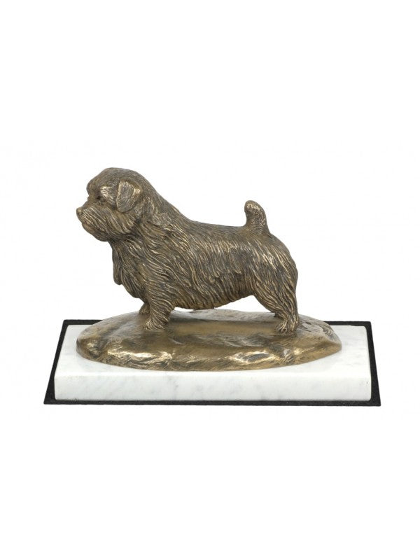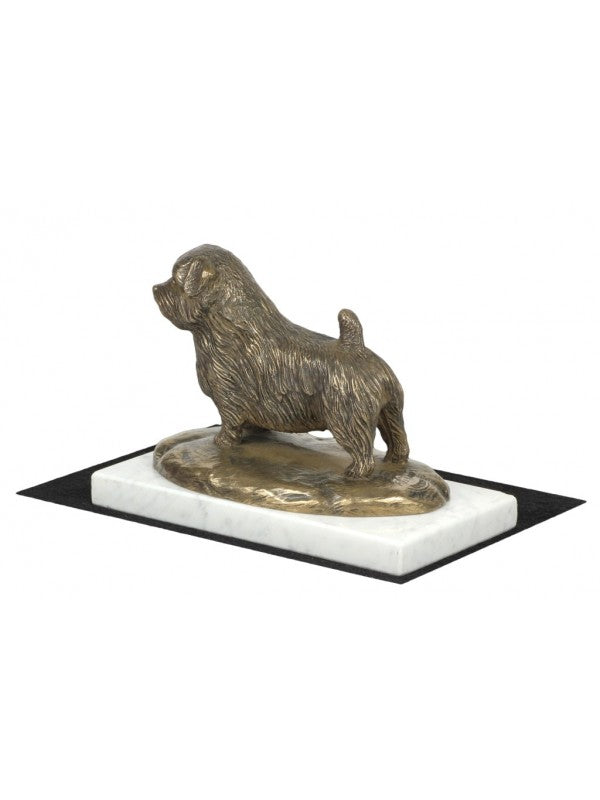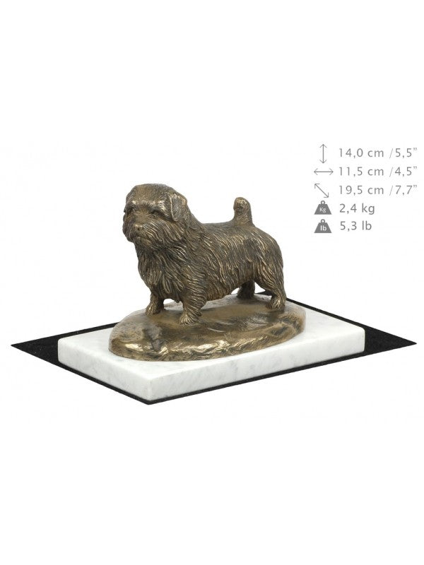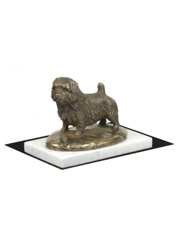 Handgjord Norfolkterrier-statyetti kallstöpt brons med interiör i stark kvarts ståendes på vit marmor i begränsad upplaga.