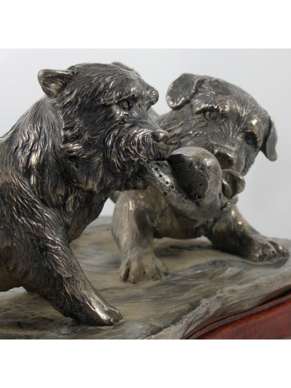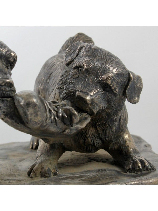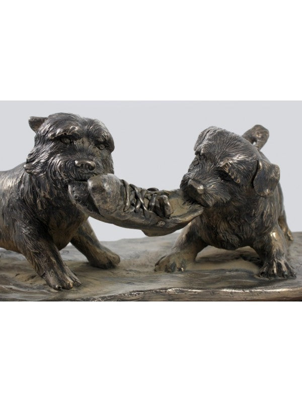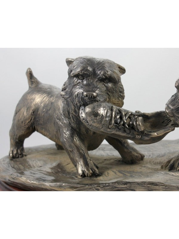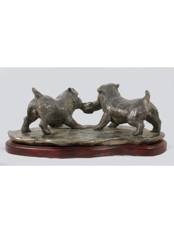 Handgjord Norwichterrier-statyett i kallstöpt brons med interiör i stark kvarts ståendes på bas i trä i begränsad upplaga.