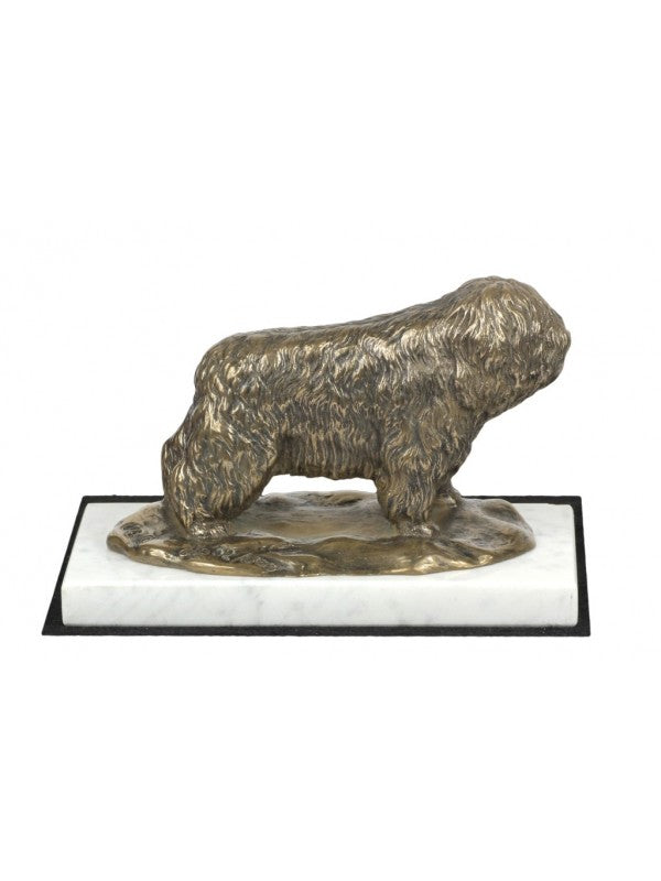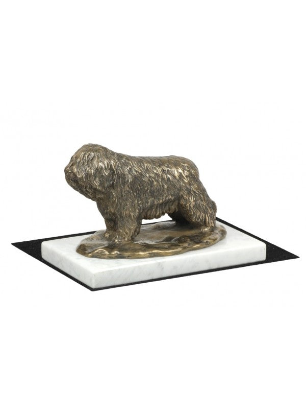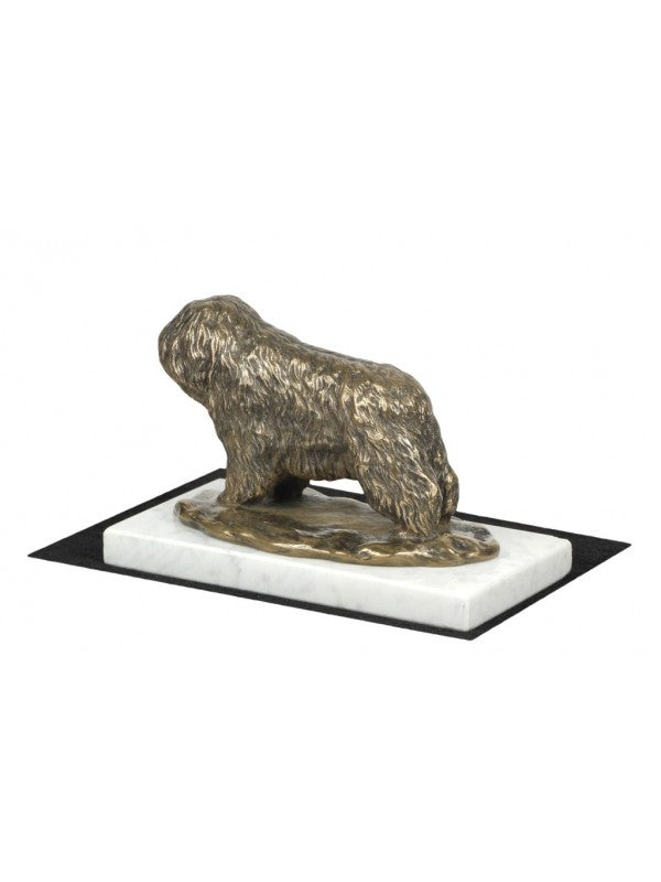 Handgjord Polski owczarek nizinny-statyetti kallstöpt brons med interiör i stark kvarts ståendes på vit marmor i begränsad upplaga.