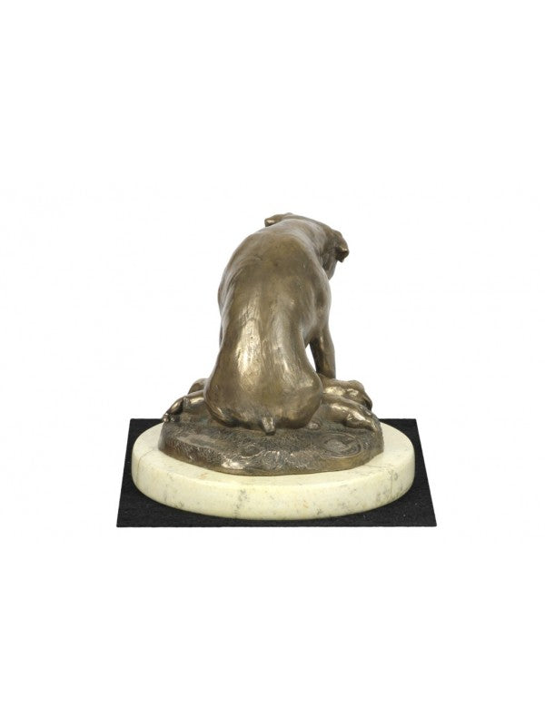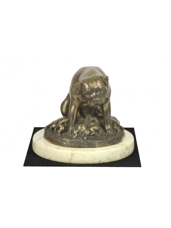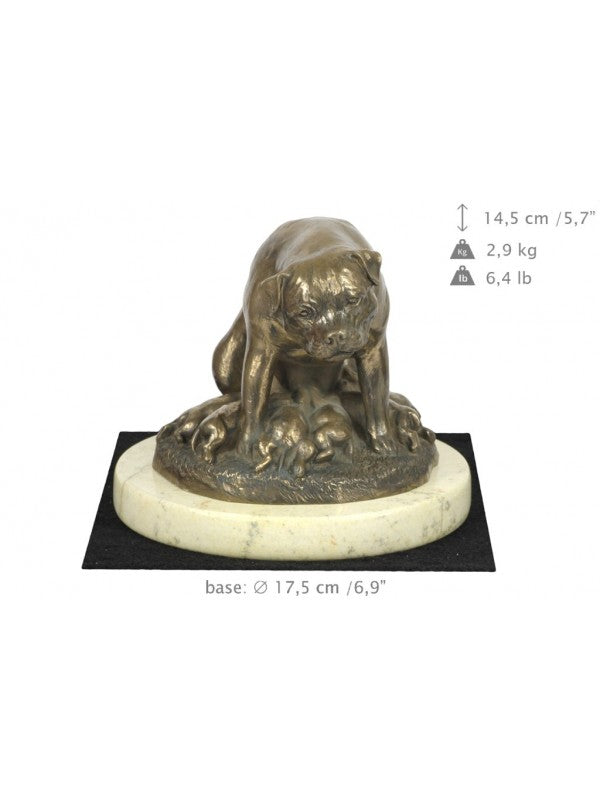 Handgjord Rottweiler-statyett i kallstöpt brons med interiör i stark kvarts ståendes på sandmarmor i begränsad upplaga.