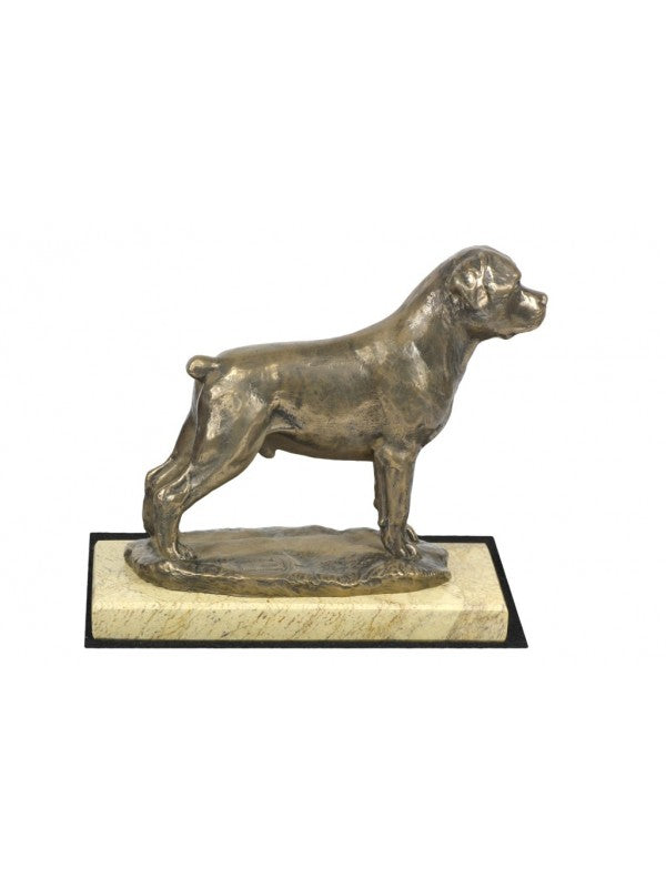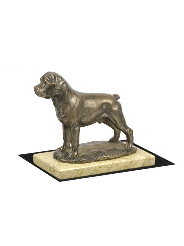 Handgjord Rottweiler-statyett i kallstöpt brons med interiör i stark kvarts ståendes på sandmarmor i begränsad upplaga.