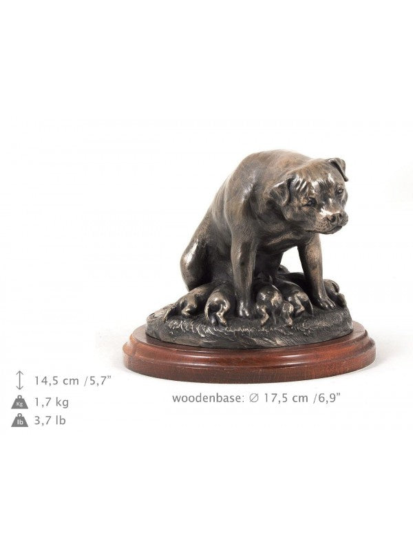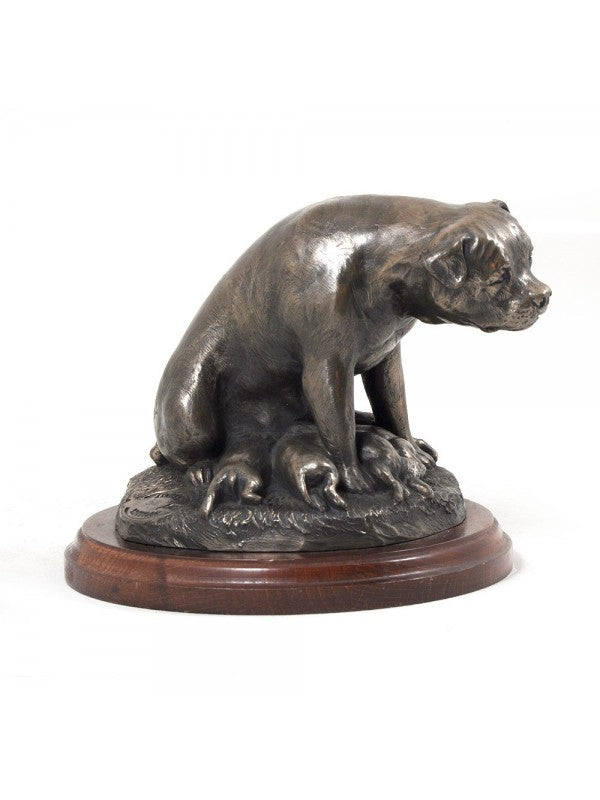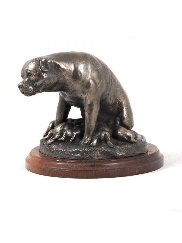 Handgjord Rottweiler-statyett i kallstöpt brons med interiör i stark kvarts ståendes på bas i trä i begränsad upplaga.
