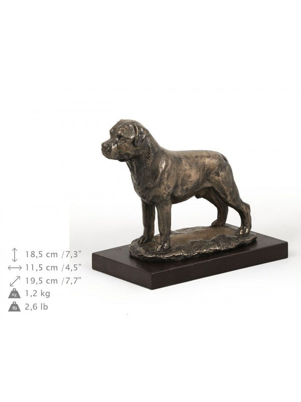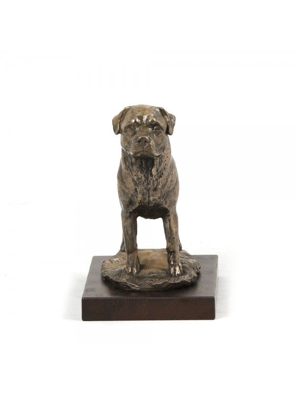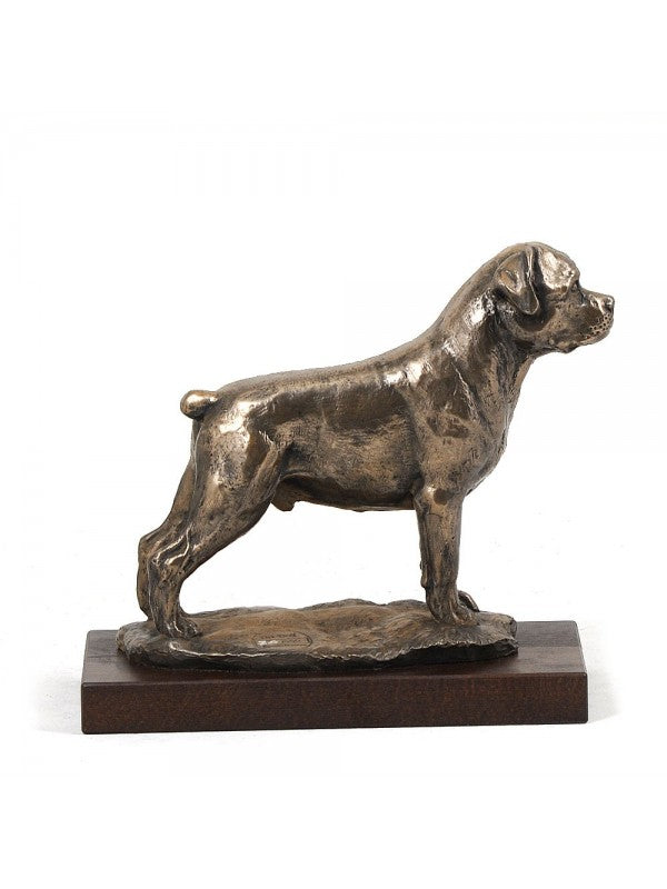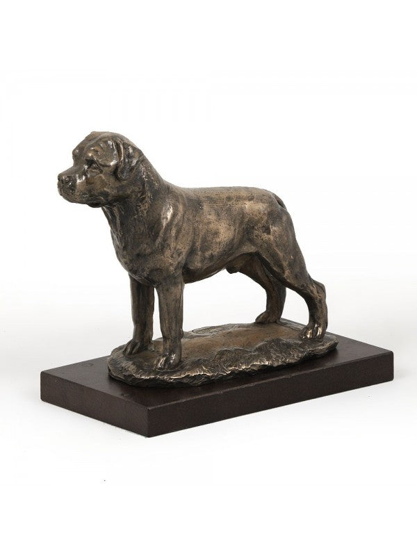 Handgjord Rottweiler-statyett i kallstöpt brons med interiör i stark kvarts ståendes på bas i trä i begränsad upplaga.