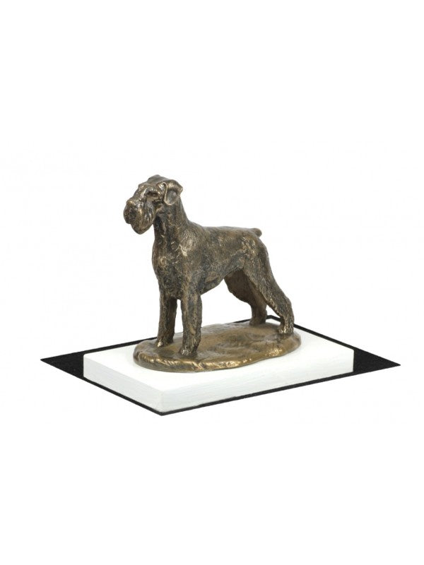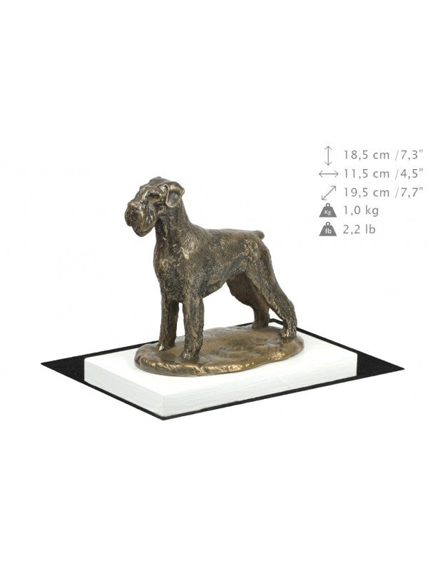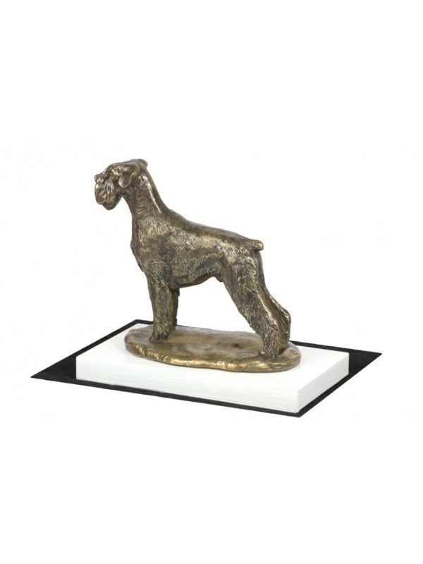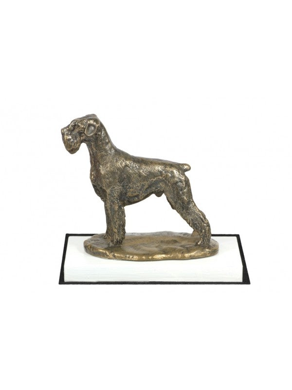Handgjord Schnauzer-statyetti kallstöpt brons med interiör i stark kvarts ståendes på bas i vitt trä i begränsad upplaga.