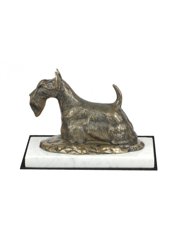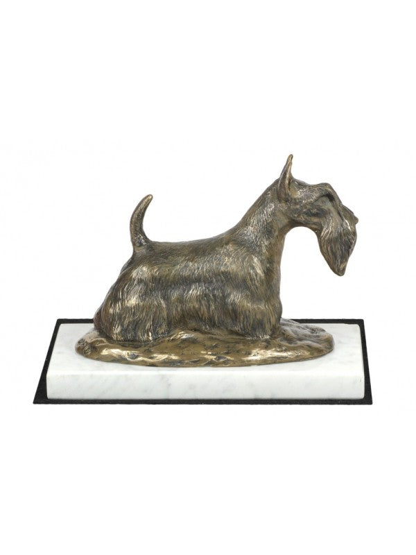 Handgjord Skotsk terrier-statyetti kallstöpt brons med interiör i stark kvarts ståendes på vit marmor i begränsad upplaga.