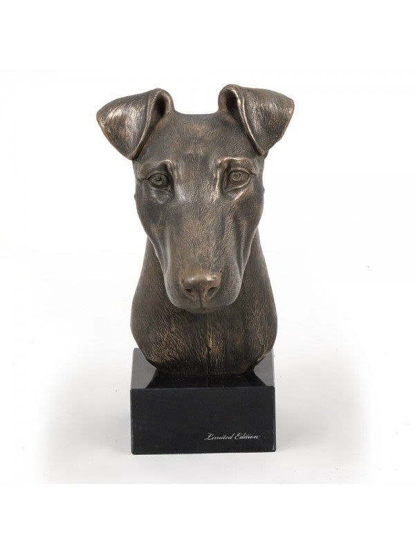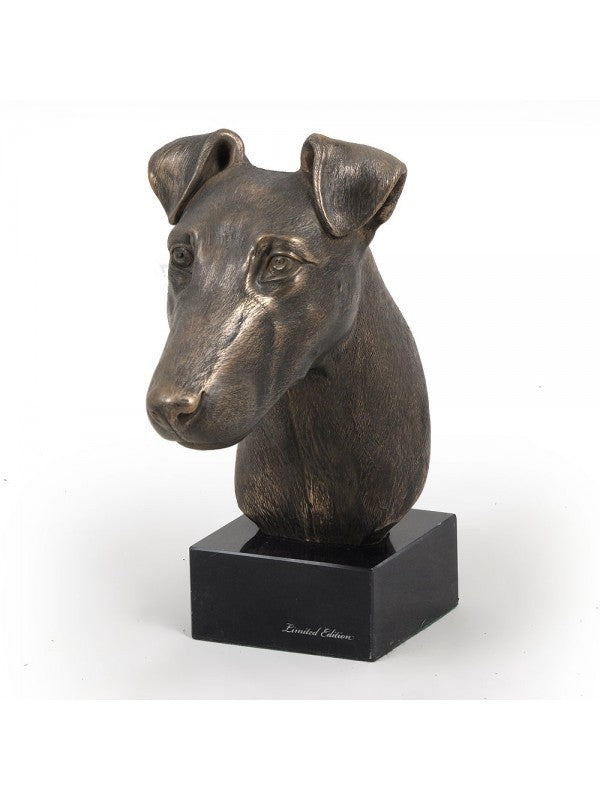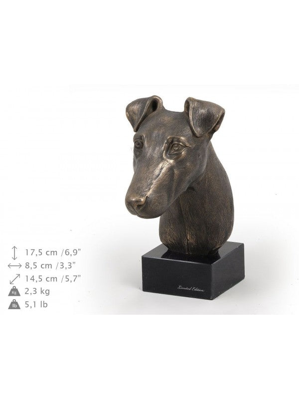 Handgjord Släthårig foxterrier-figurin i kallstöpt brons med interiör i stark kvarts ståendes på marmor i begränsad upplaga.