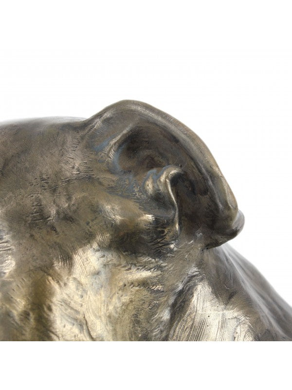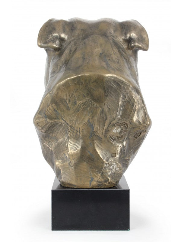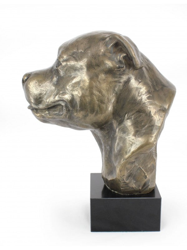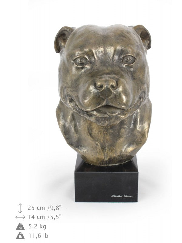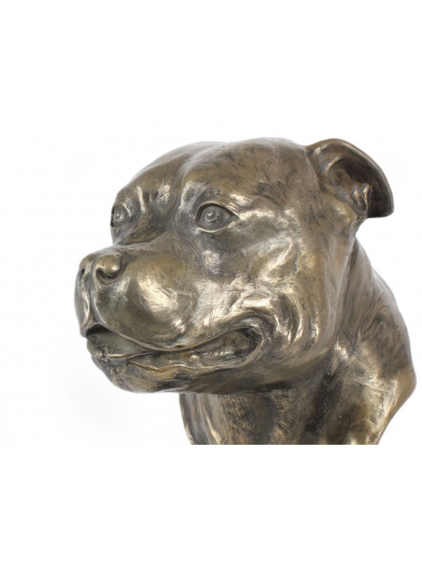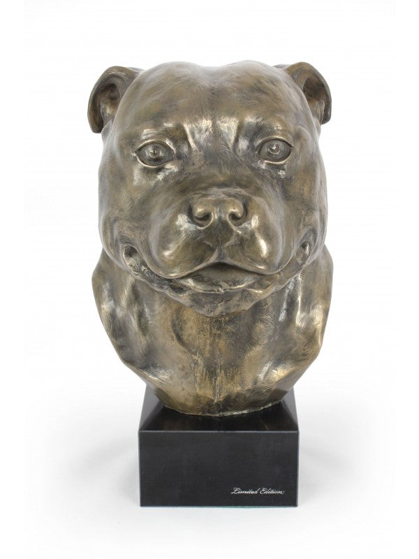 Handgjord Staffordshire bullterrier-figurin i kallstöpt brons med interiör i stark kvarts ståendes på marmor i begränsad upplaga.