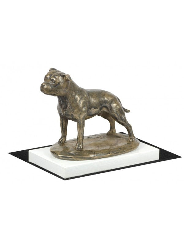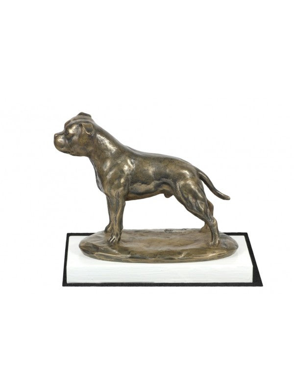 Handgjord Staffordshire bullterrier-statyett i i äkta brons med interiör i stark kvarts ståendes på bas i vitt trä i begränsad upplaga.