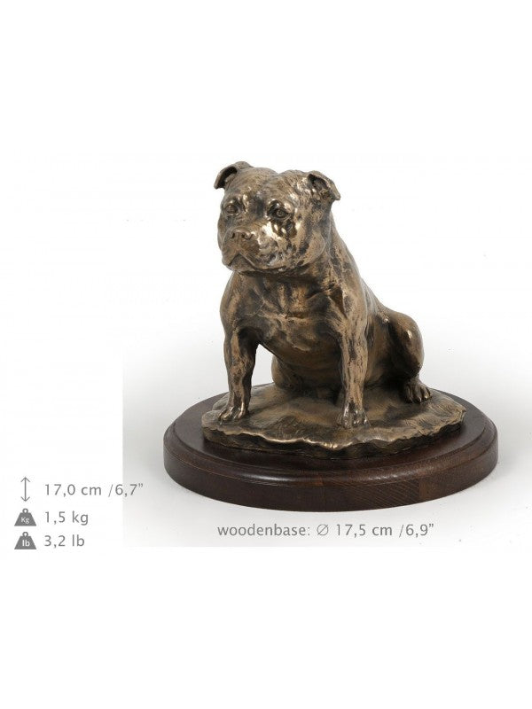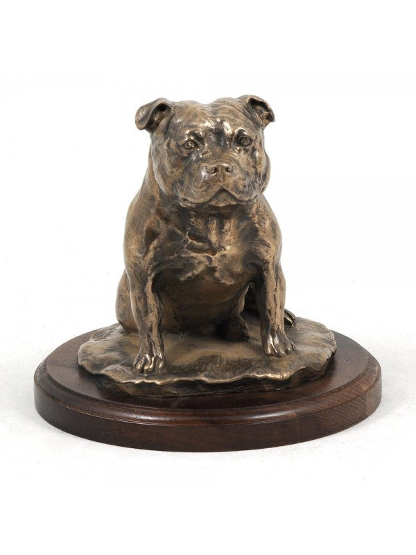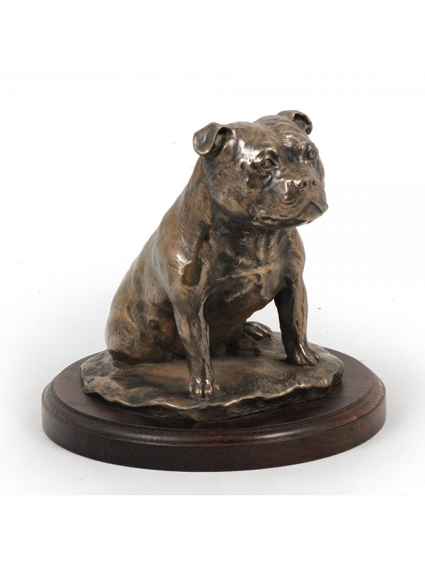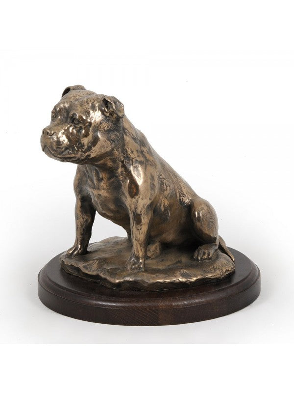 Handgjord Staffordshire bullterrier-statyett i kallstöpt brons med interiör i stark kvarts ståendes på bas i trä i begränsad upplaga.