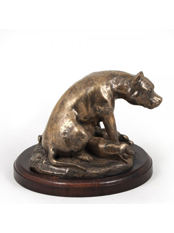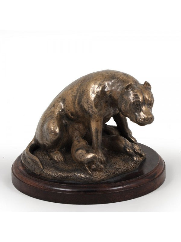 Handgjord Staffordshire bullterrier-statyetti kallstöpt brons med interiör i stark kvarts ståendes på bas i trä i begränsad upplaga.