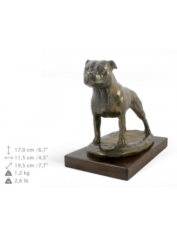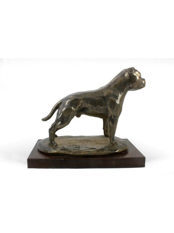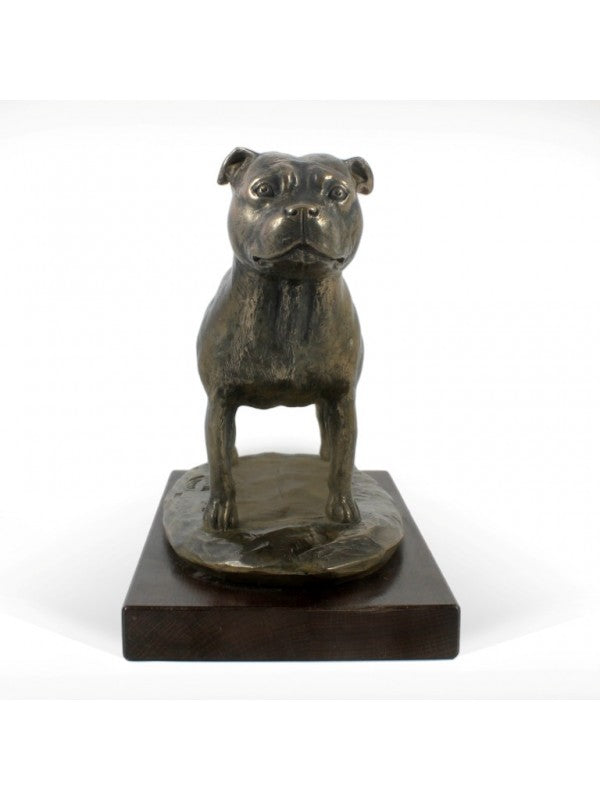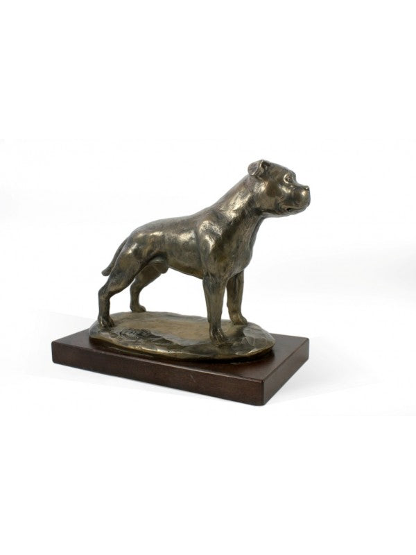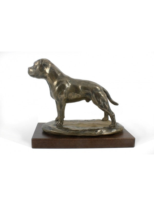 Handgjord Staffordshire bullterrier-statyetti kallstöpt brons med interiör i stark kvarts ståendes på bas i trä i begränsad upplaga.
