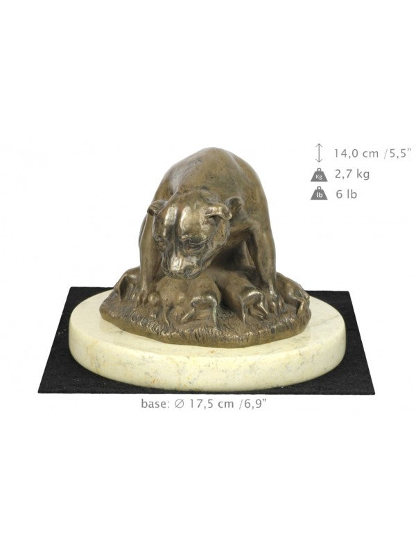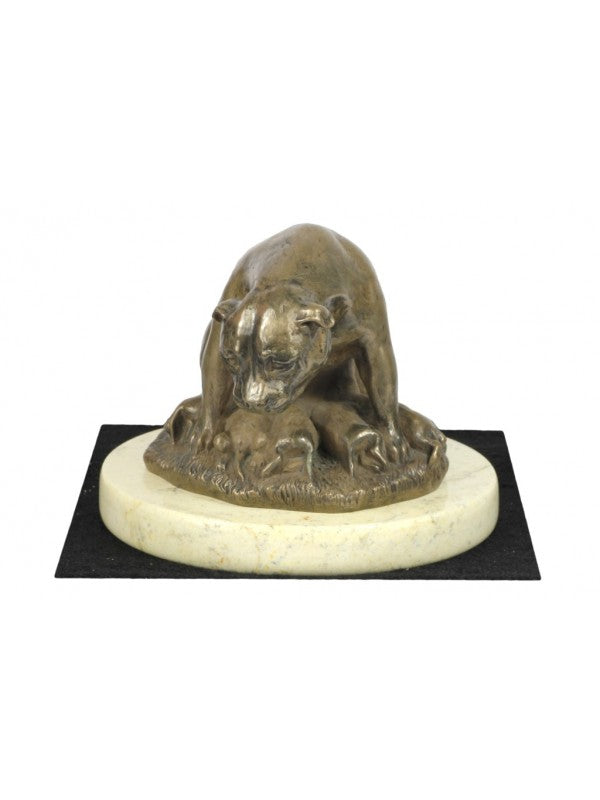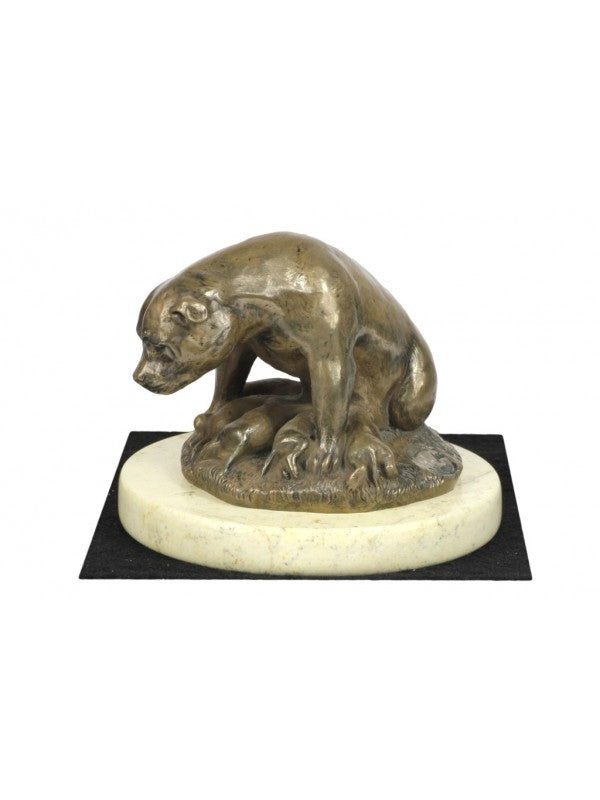 Handgjord Staffordshire bullterrier-statyett i kallstöpt brons med interiör i stark kvarts ståendes på sandmarmor i begränsad upplaga.