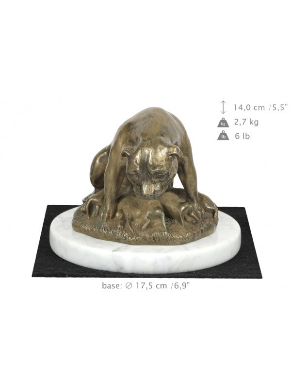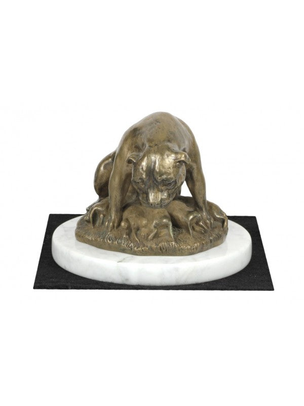 Handgjord Staffordshire bullterrier-statyetti kallstöpt brons med interiör i stark kvarts ståendes på vit marmor i begränsad upplaga.